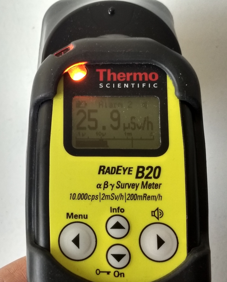 Aber das kleine Zuiko hält gut mit: zwischen 25 und 30 µSv/h an der Hinterlinse. Hauptsächlich alpha, weil mein Radex One (beta/gamma) nur etwa 1 µSv/h anzeigt (von Detektorempfindlichkeit wollen wir jetzt nicht anfangen). Minimal an der Vorderlinse.