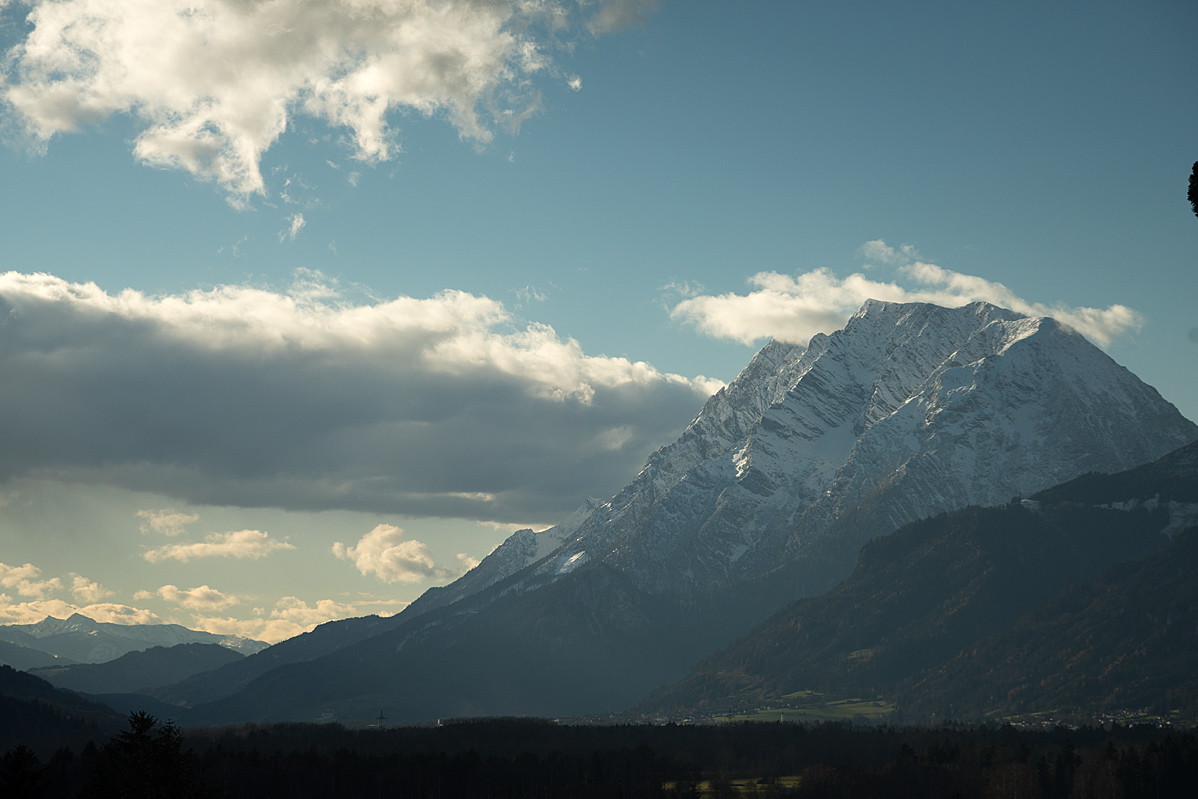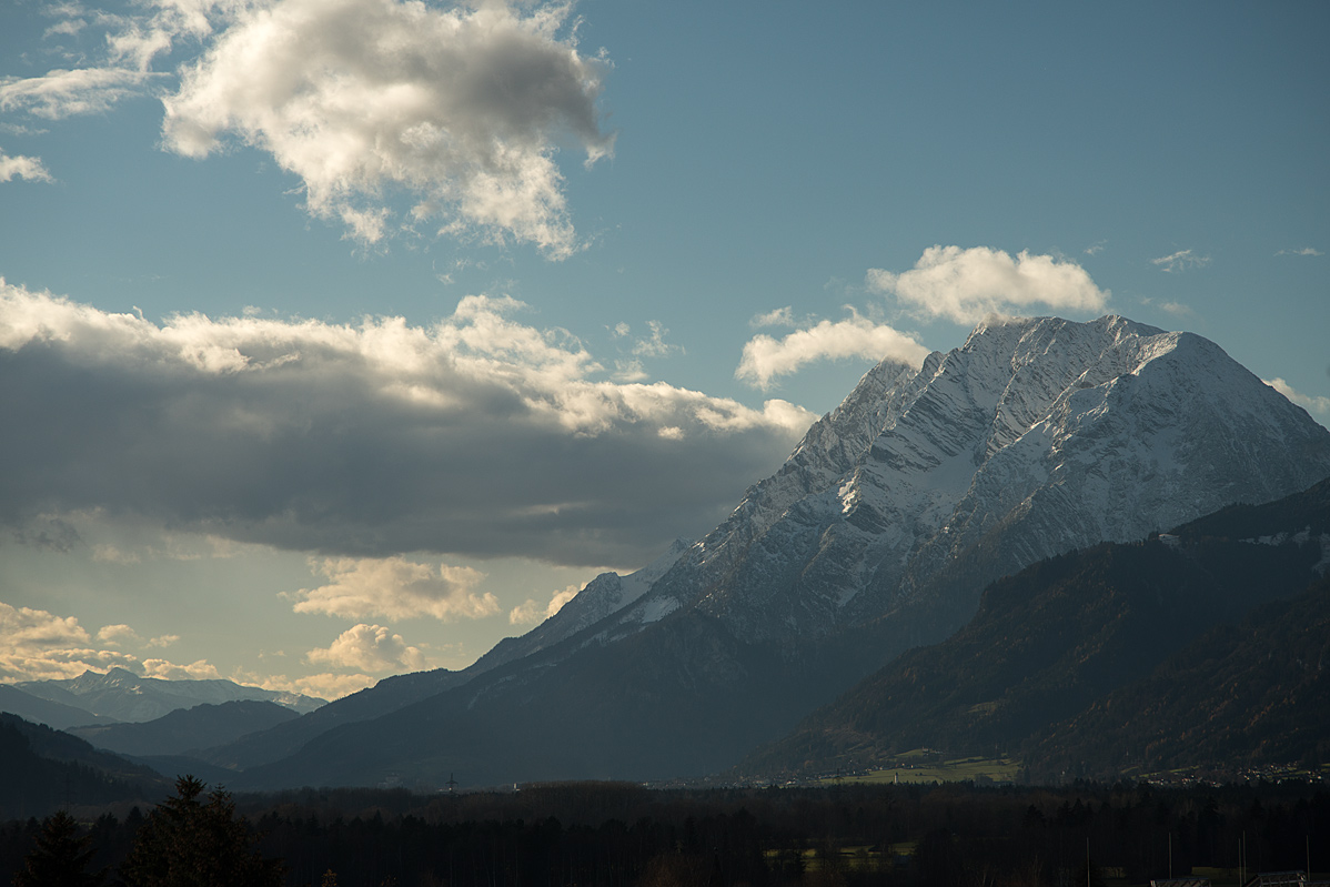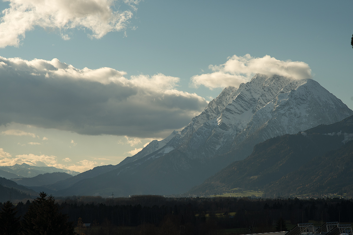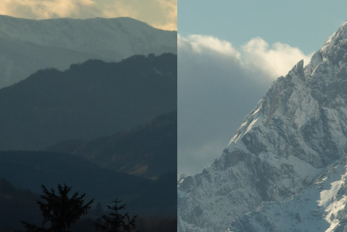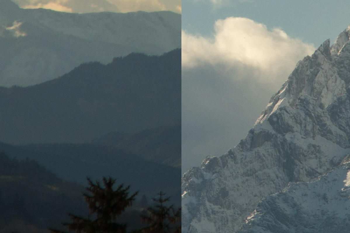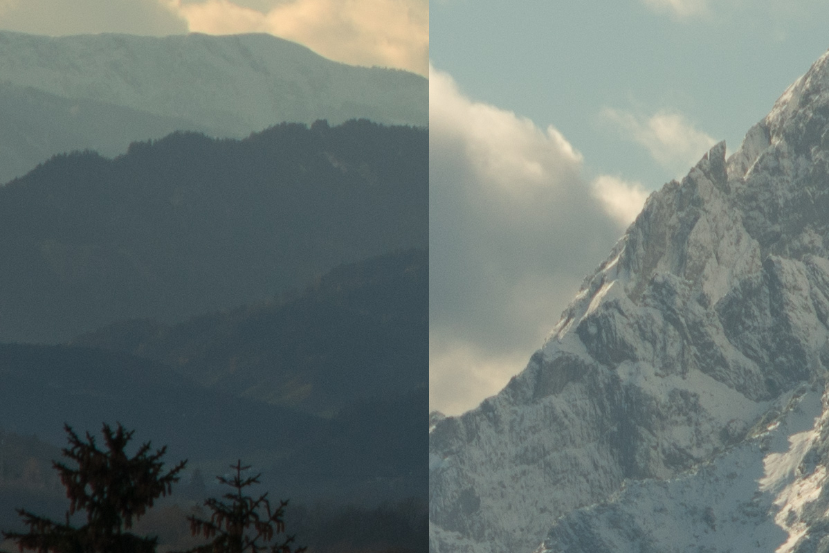 Nachdem sich 'Takeda' über die Abbildung seines Pentacon 2.8/135 beschwert hatte und ich inzwischen auch über eine vollformatige Ablichtungsapparatur verfüge, wollte ich sehen, ob das Pentacon dort wirklich so schlecht abschneidet. Schließlich war es ja mein erstes Altglas und der eigentliche Grund, warum sich inzwischen noch einige weitere alte Gläser angesammelt haben. Die Spitze des Grimming ist auch wieder weiß, also habe ich den wieder als Testmotiv verwendet. Alle Bilder sind ohne Streulichtblende, aber mit dem selben Polfilter entstanden; Blende 8, ISO 200 an Sony A7RII.