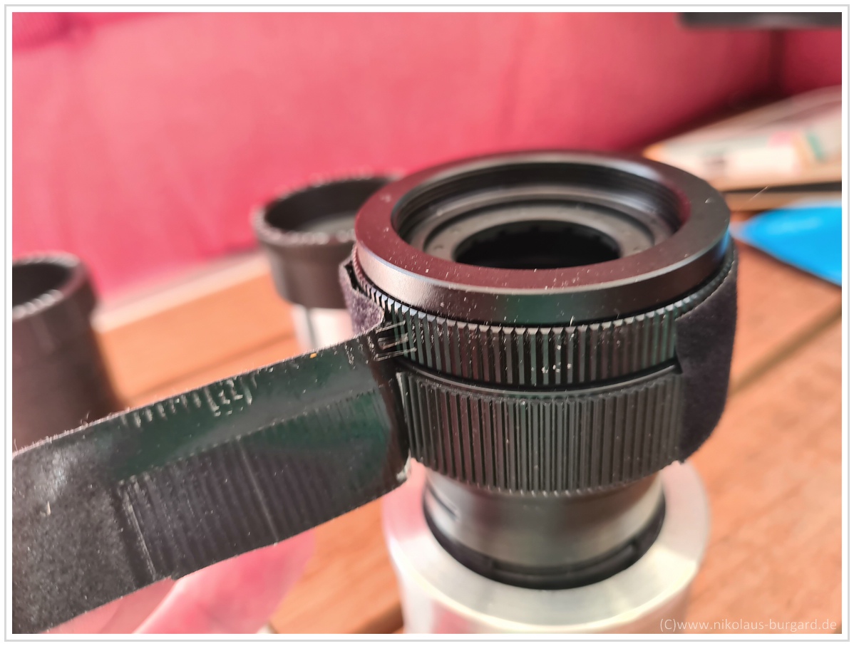 Dann Klebeband um Irisblende und Plastik"gegenlichtblende" des Objektives: