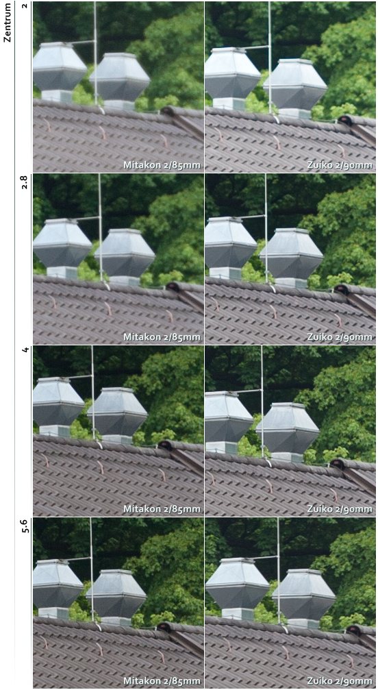 Der nächste Test ist gegen Unendlich. Das Motiv ist zwar etwas langweilig, aber darum geht's ja jetzt nicht. An der Canon 5D tritt das Mitakon wieder gegen das Zuiko 2/90mm an, die Vergleichbilder vom Nikkor 2/85mm waren leider falsch fokussiert und fehlen deshalb.