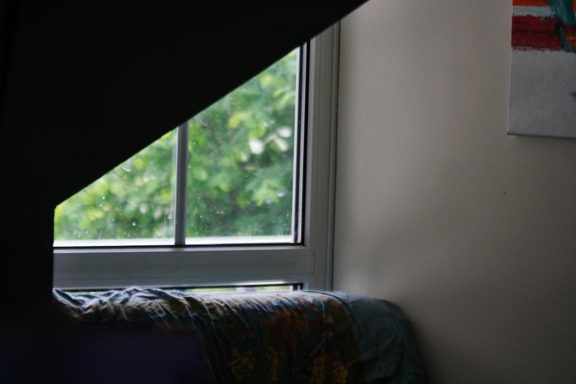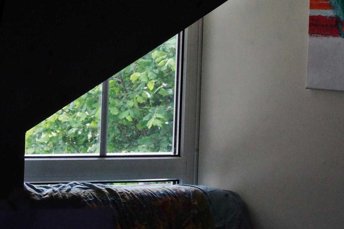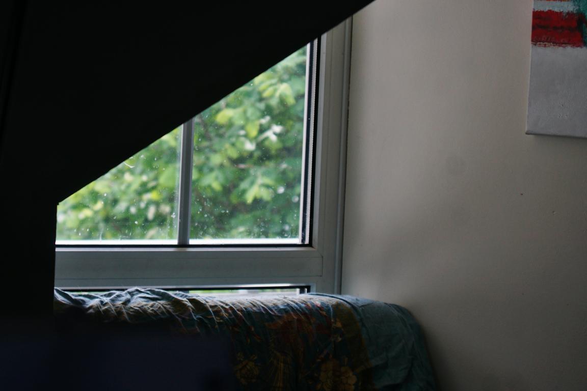 Scharfgestellt ist auf den Fensterrahmen, die Irisblende sitzt nun vorne. Am Hintergrund sieht man es.