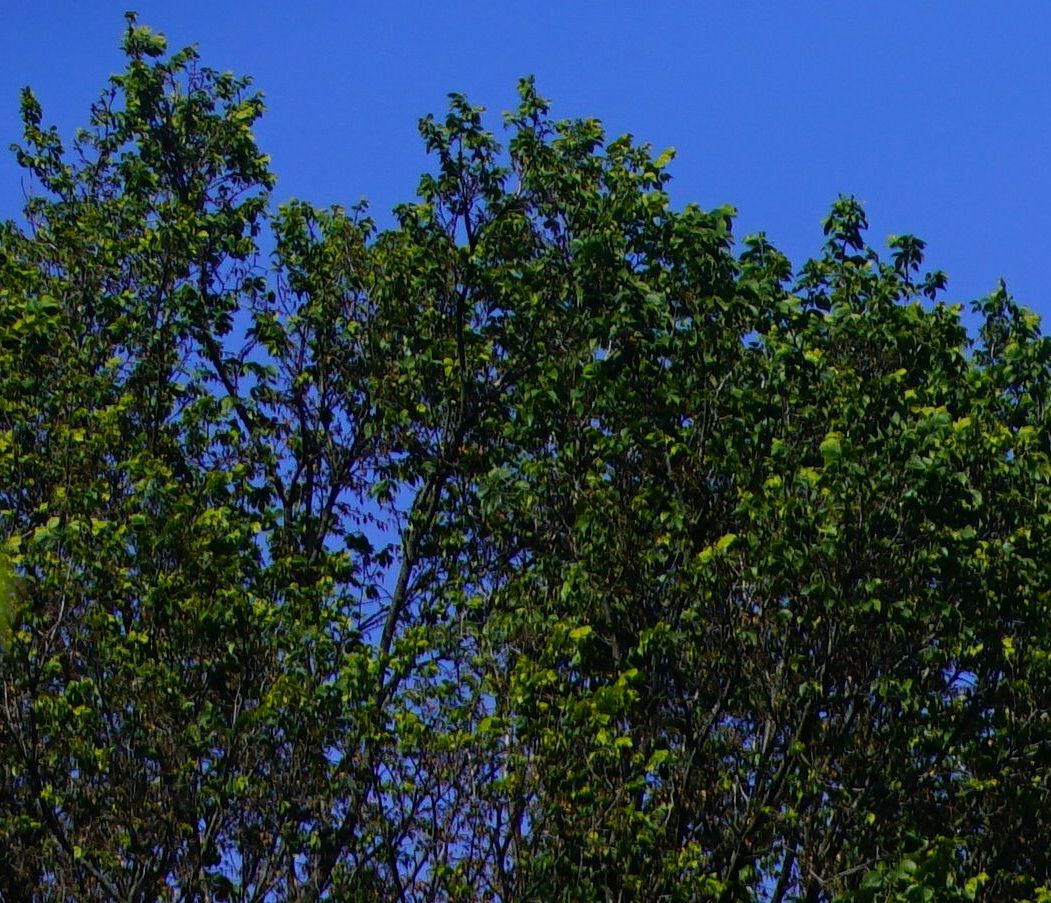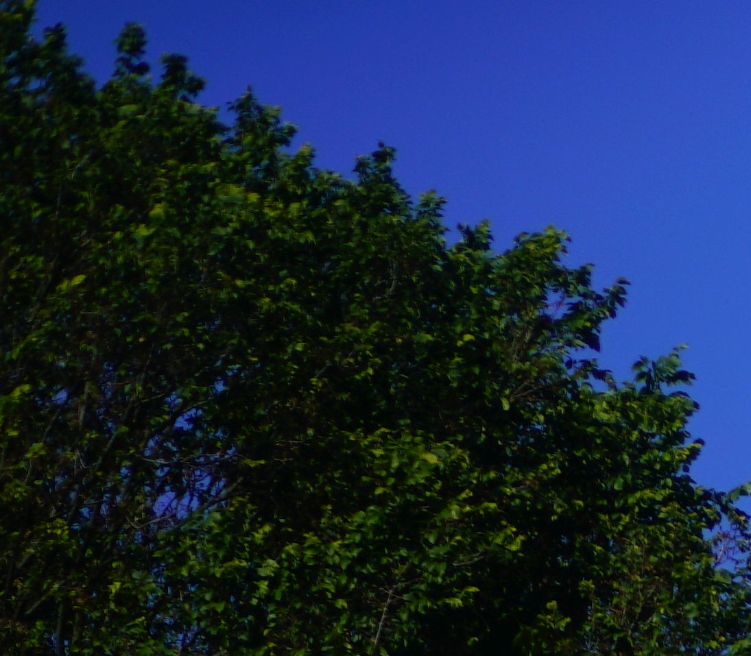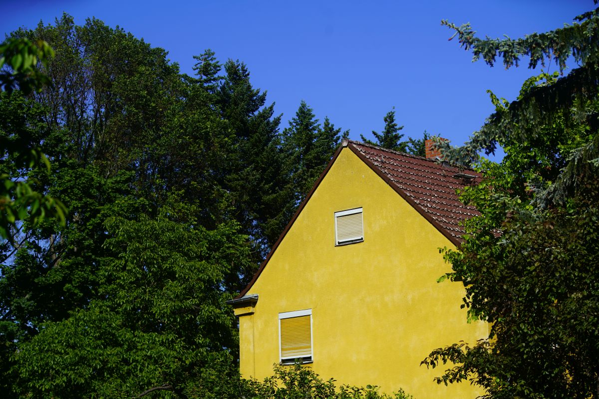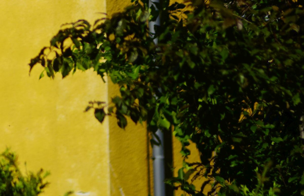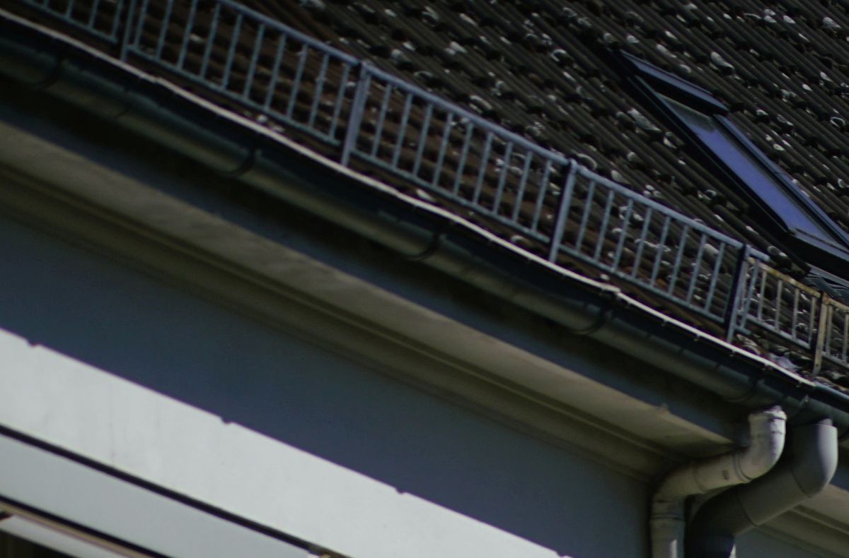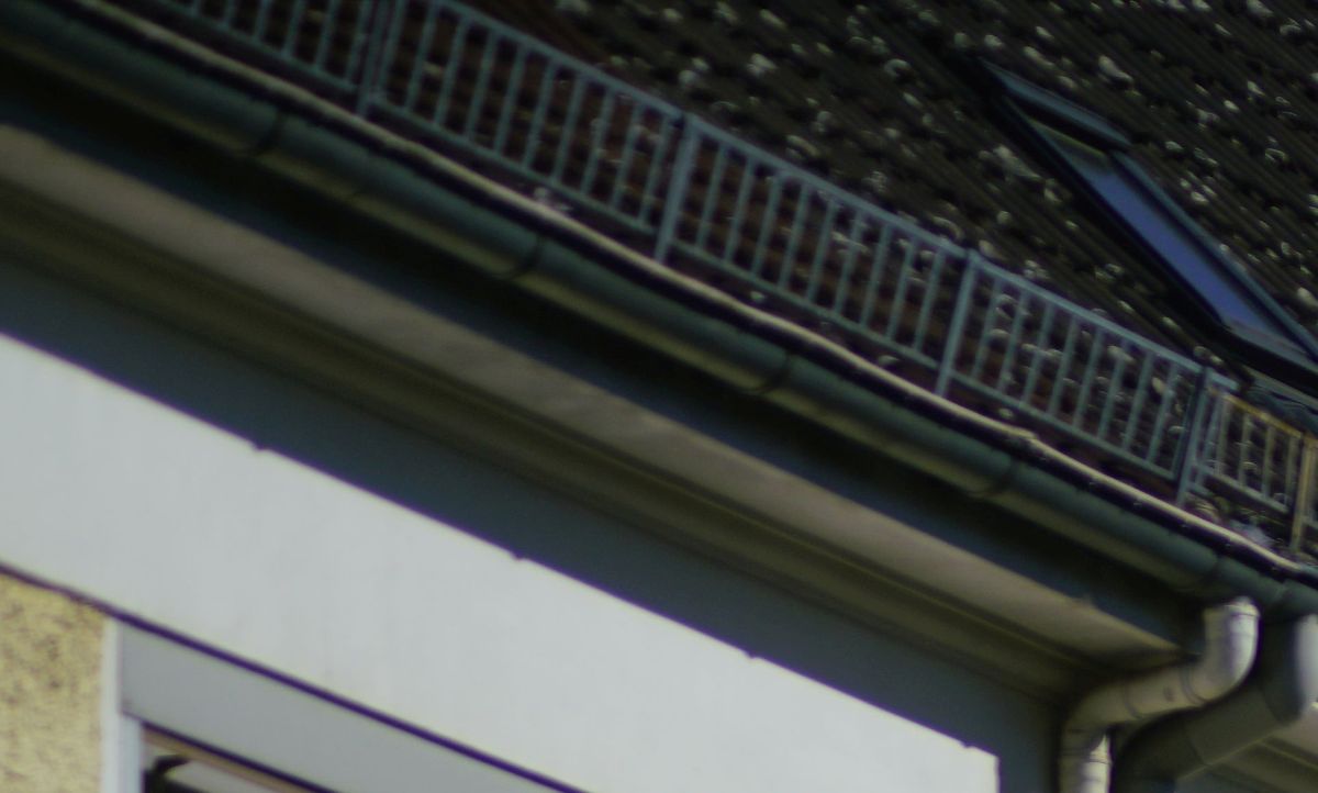 Jetzt ein Blick zum Nachbargarten, links oben ist weit hinter dem Fokuspunkt, der Auf der Hauswand liegt, rechts unten weit davor. Beide Ecken in Crops, erst mit, dann ohne Blende: