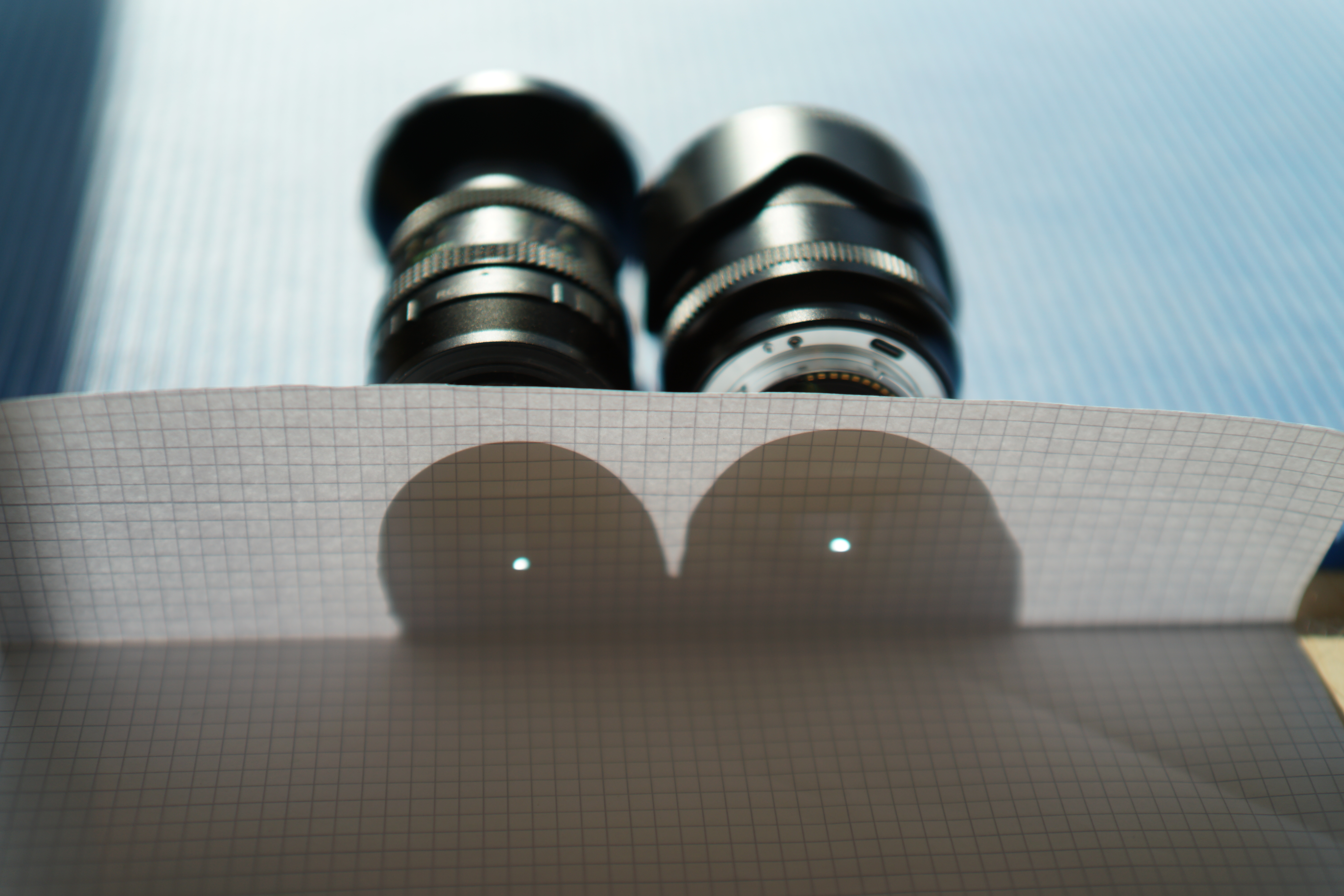 Das wollte ich gerne mal ausprobieren und habe die Objektive offen in die Sonne gerichtet und den Lichtfleck fotografiert... der Durchmesser bei Blattdistanz auf Sensorebene ist bei beiden eher ein kleiner Punkt - aber weiter entfernt lässt sich der Unterschied gut zeigen.