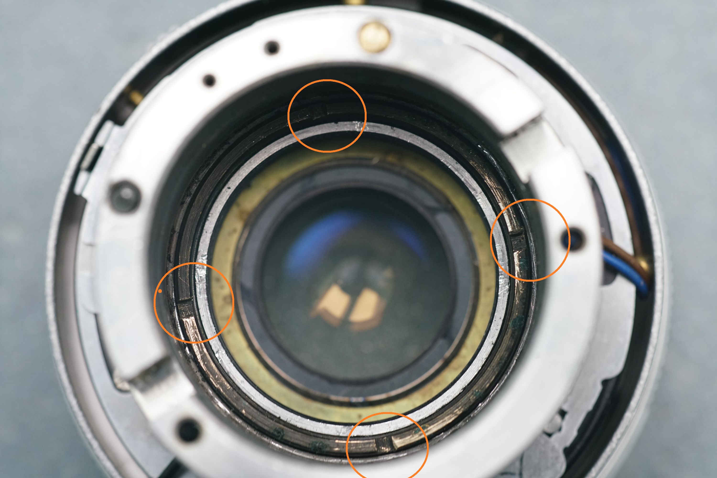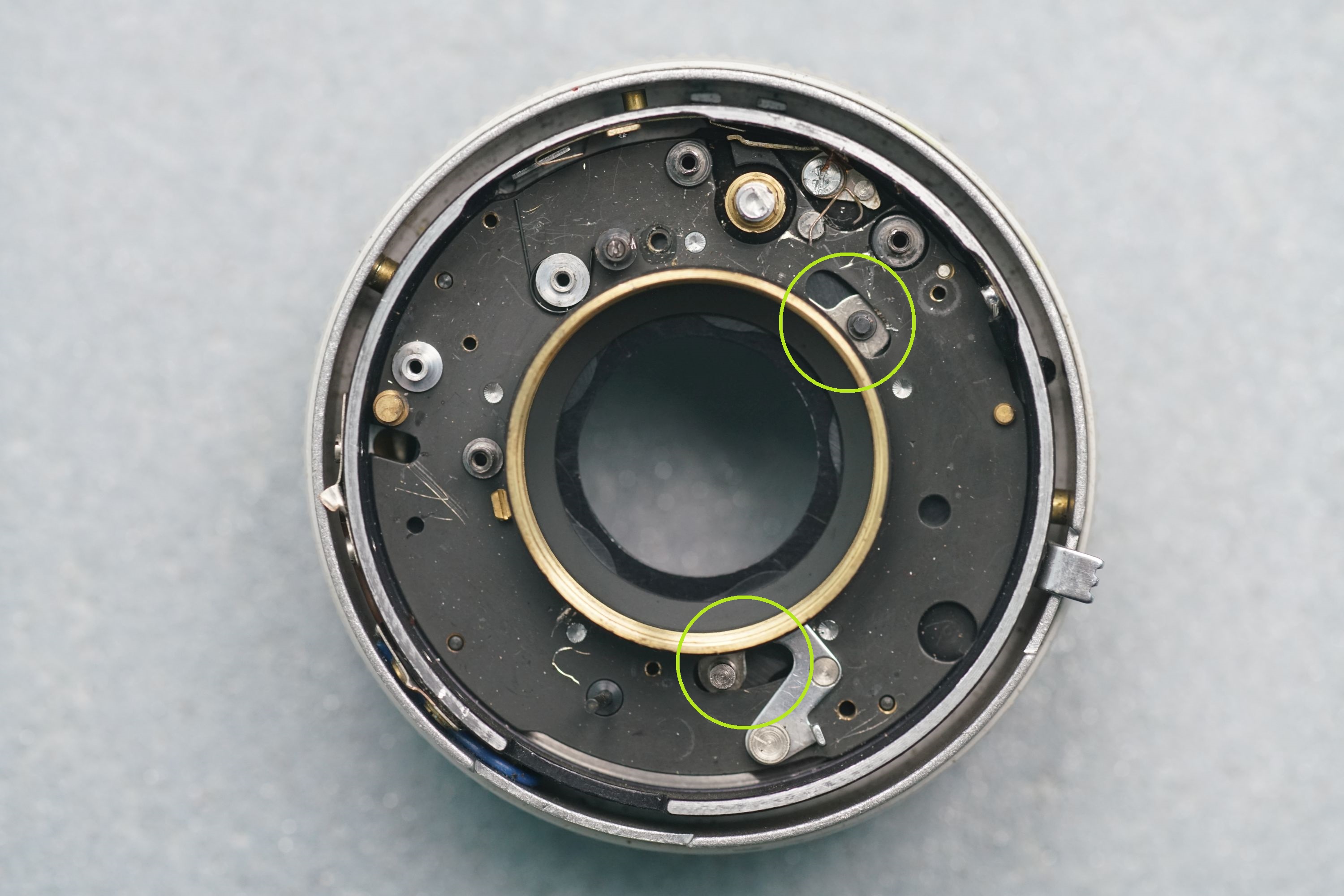 Die markierten Stellen sind die Steuerungen für die Lamellen des Zentralverschlusses. Dieser steht