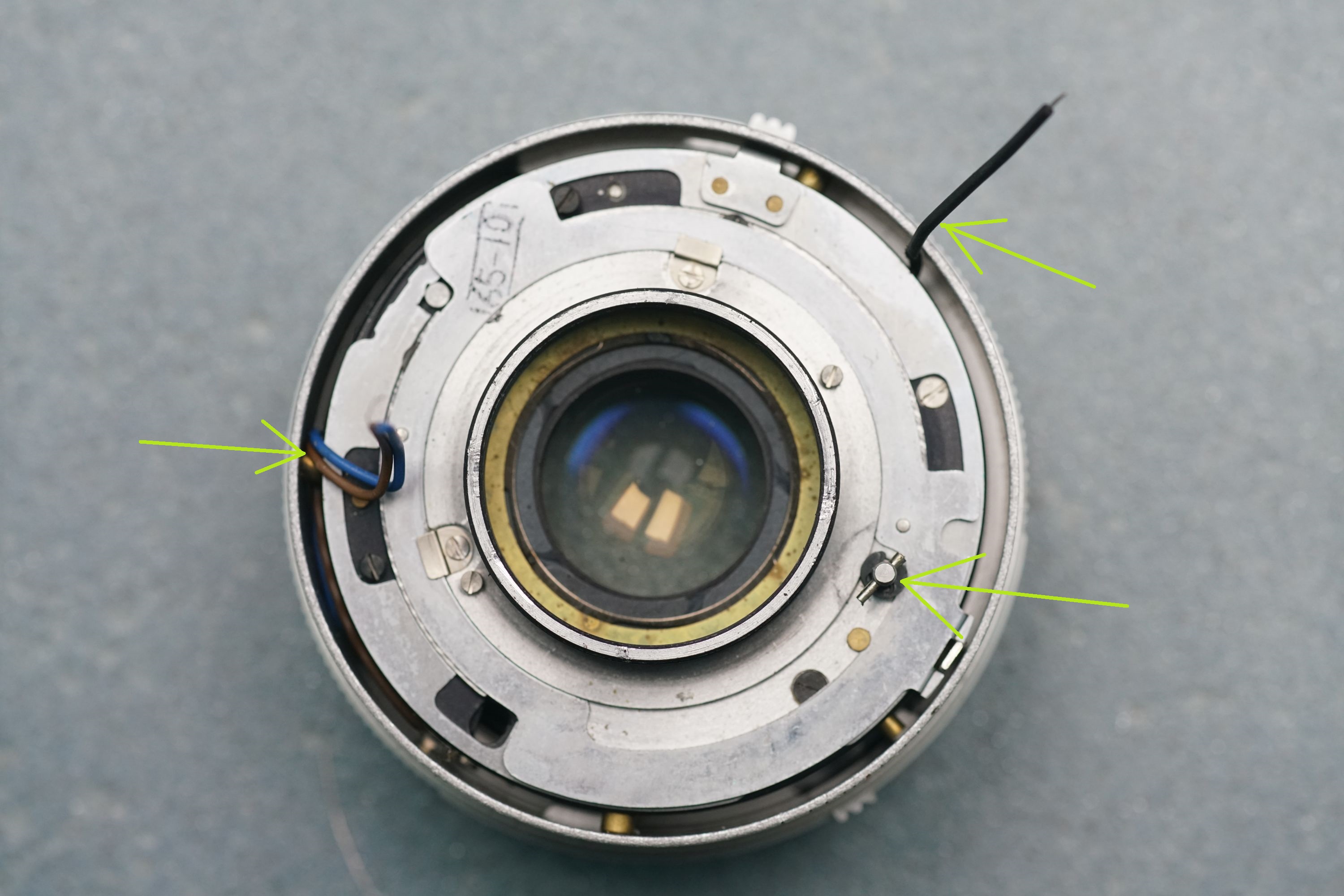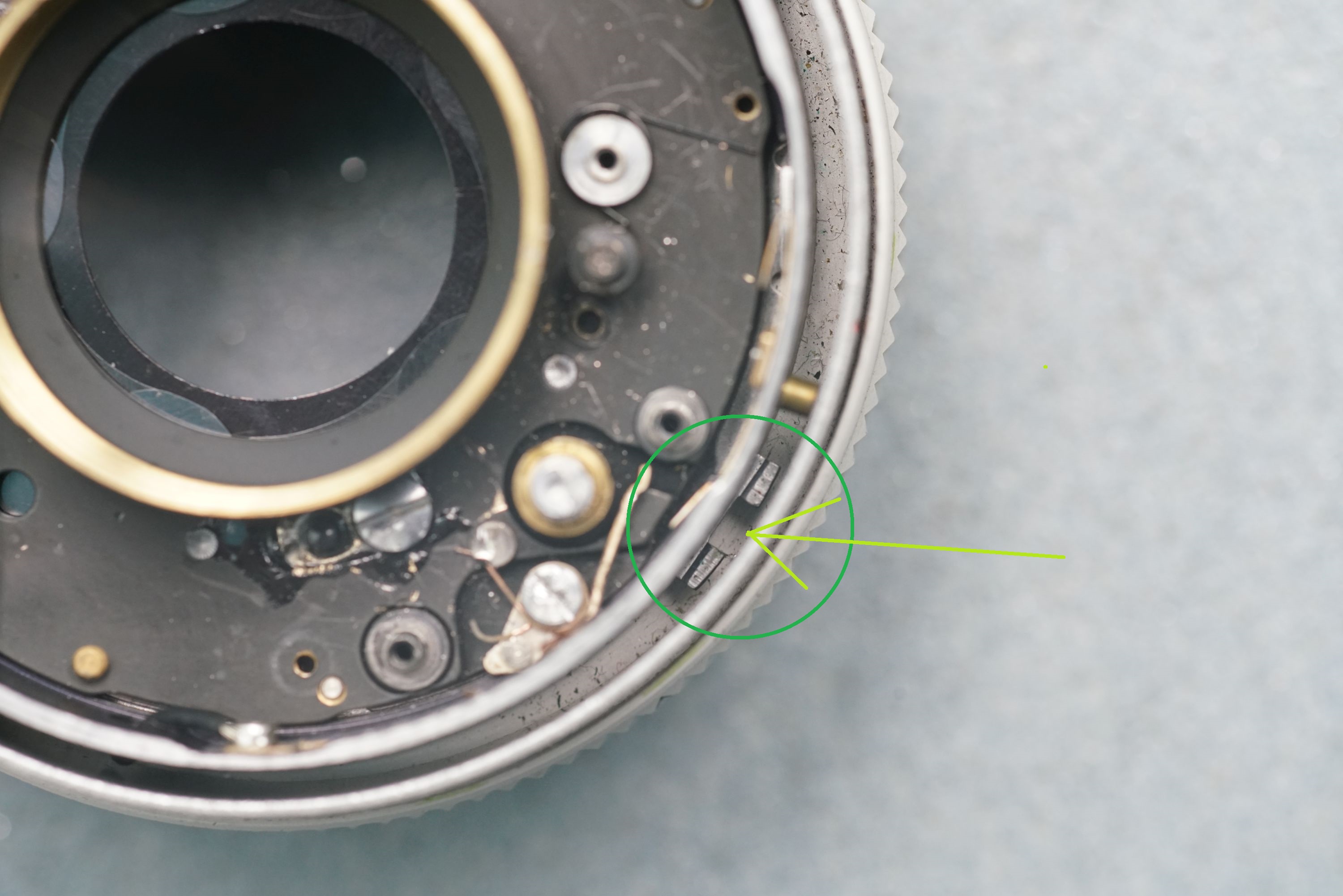 Hier sieht man den Kontakt, durch welchen die Blende gesteuert wird. Es ist beim Zusammenbau