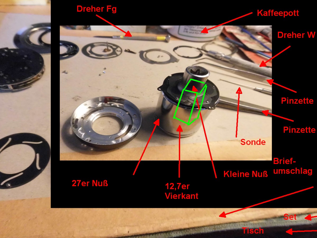 Trick 1: Gelbe Markierung am Schraubendreher mit fester Klinge. Wenn die alle auf einem Stapel liegen und silbrig glänzen verschwendet man sonst leicht die eine oder andere Zehntelsekunde bei der Suche nach der richtigen Größe. Klingen ggf. zuschleifen um "spezielle" Schrauben zu erwischen (Praktica-Gehäuseschrauben haben feine Schlitze, ...), je Größe eine Farbe spendieren. Gerne auch Kreuz-/Langschlitz klar kennzeichnen. Zusammengestückelte Schraubendrehersammlungen (wenn alle unterschiedlich aussehen, der Kreuzschlitz evtl. gar von Märklin mit Plastikgriff) sind gegenüber tollen Sätzen wo alle gleich aussehen klar im Vorteil (besonders wenn man die Lupenbrille aufgesetzt hat).
