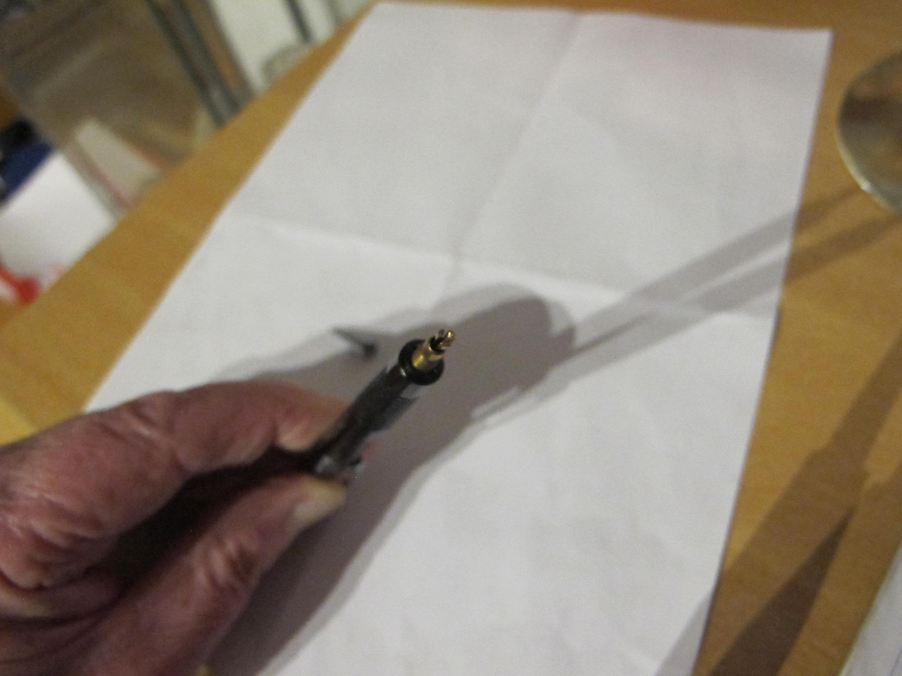 Wenn man die Spitze abschraubt, kommt dahinter eine Aufnahme zu Tage, die sich beim betätigen des Drückers nach vorn schiebt und eine dreigeteilte