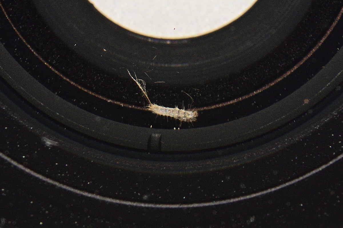 Der muss im Larvenstadium durch eines der beiden winzigen Löcher der Linsenfassung, an der man die Spannzange zum auf und zuschrauben ansetzen muss, hineingekrochen sein und dort dann gewachsen und schließlich verhungert sein.
