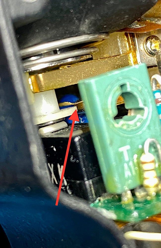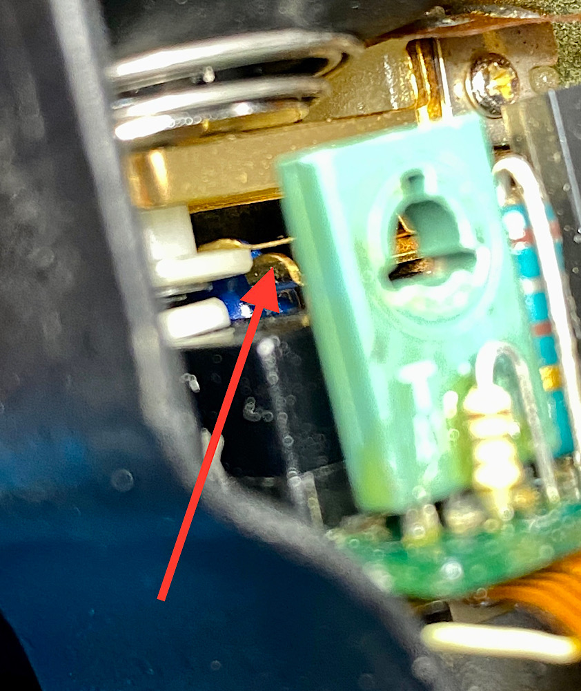 1. AUS - die beiden Metallkontakte des Schalters für die Aktivierung des Belichtungsmesssystems sind getrennt (s. Pfeil):