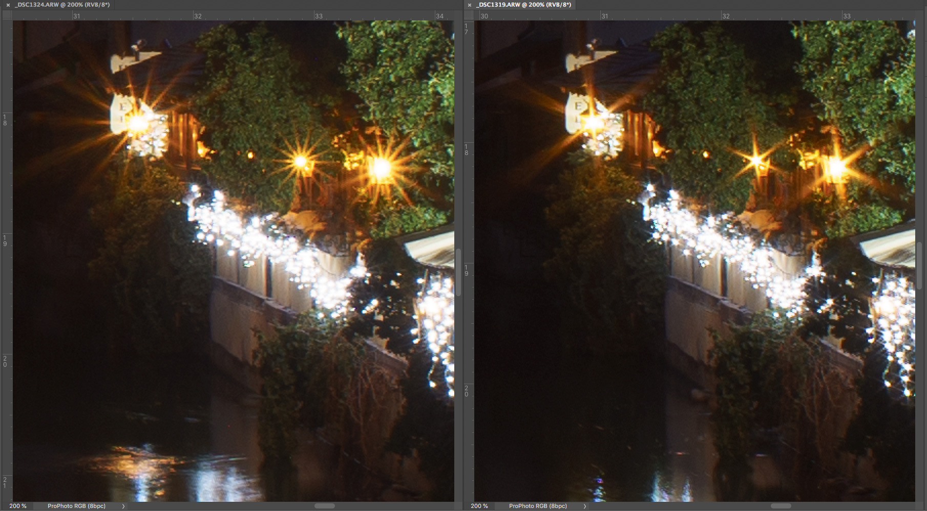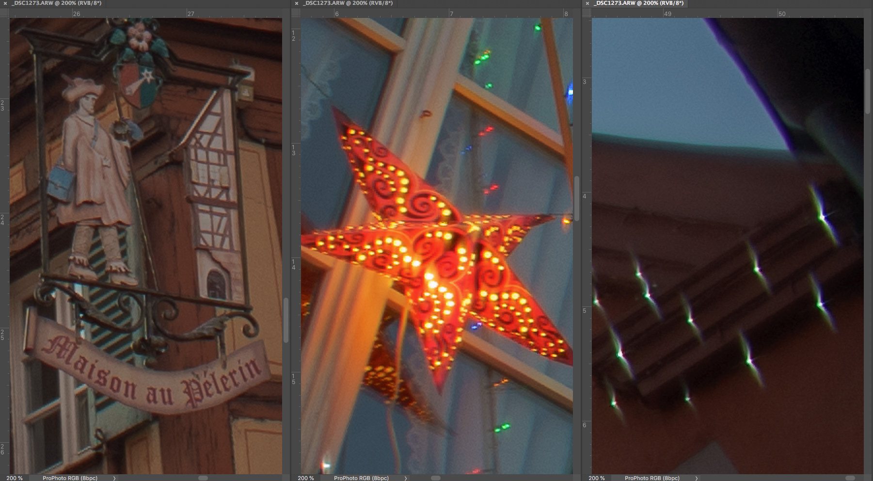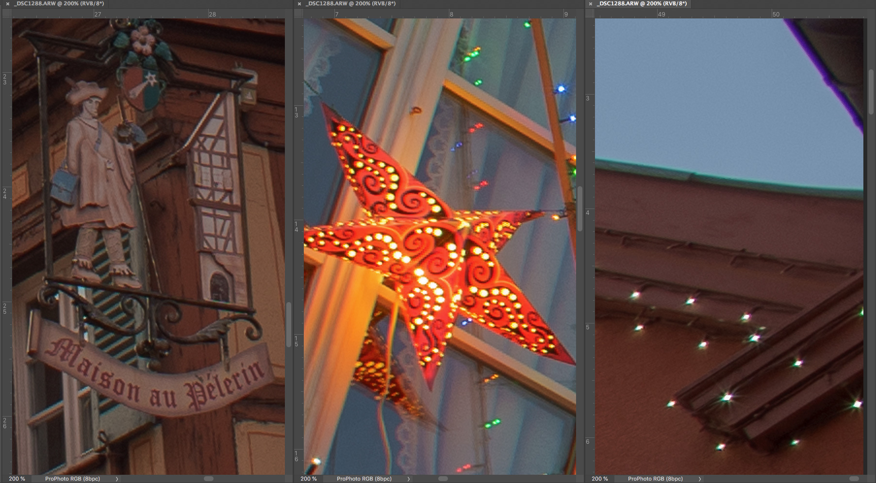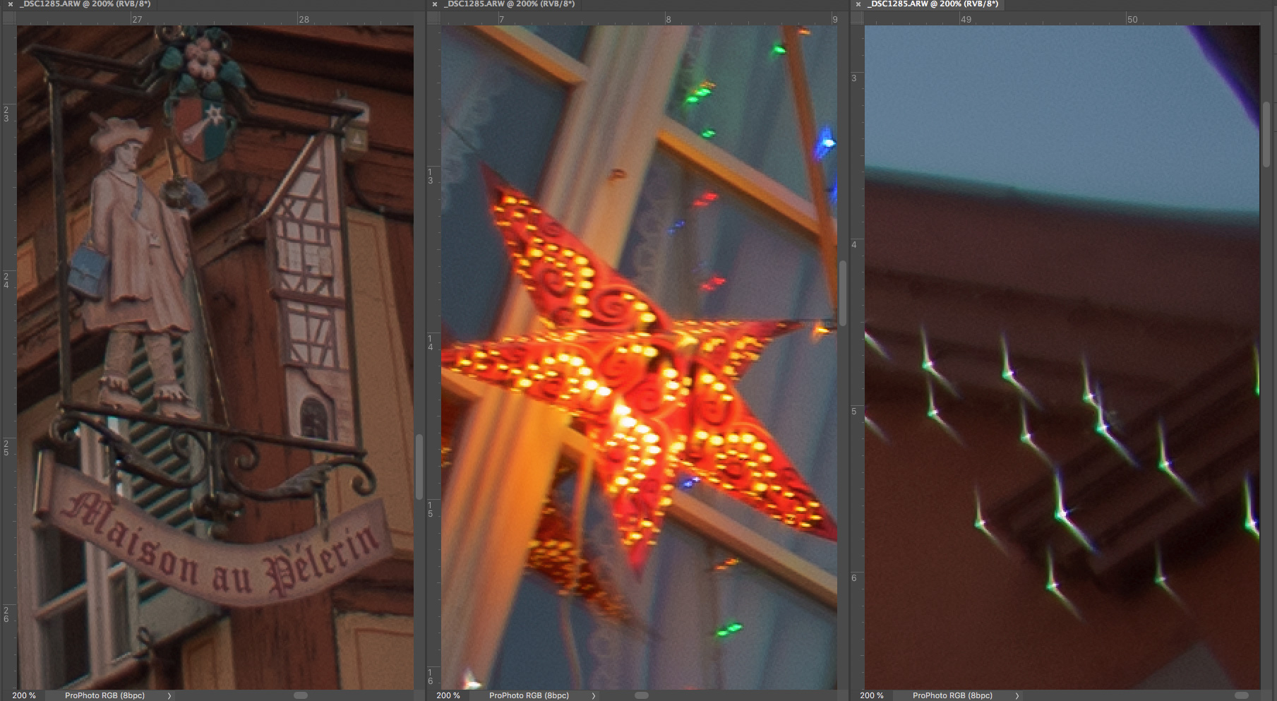 Am Bildrand und vor allem in den Bildecken sind bei beiden Objektiven bis f/5,6 ausgeprägte Komaschweife um punktförmige Lichtquellen sichtbar, die Form der Artefakte ist allerdings etwas unterschiedlich. Weiterhin kann man ohne Mühen laterale chromatische Aberrationen ausmachen, die aber sonst mittels der automatischen Korrektur in Camera Raw (hier deaktiviert) fast vollständig verschwinden.
