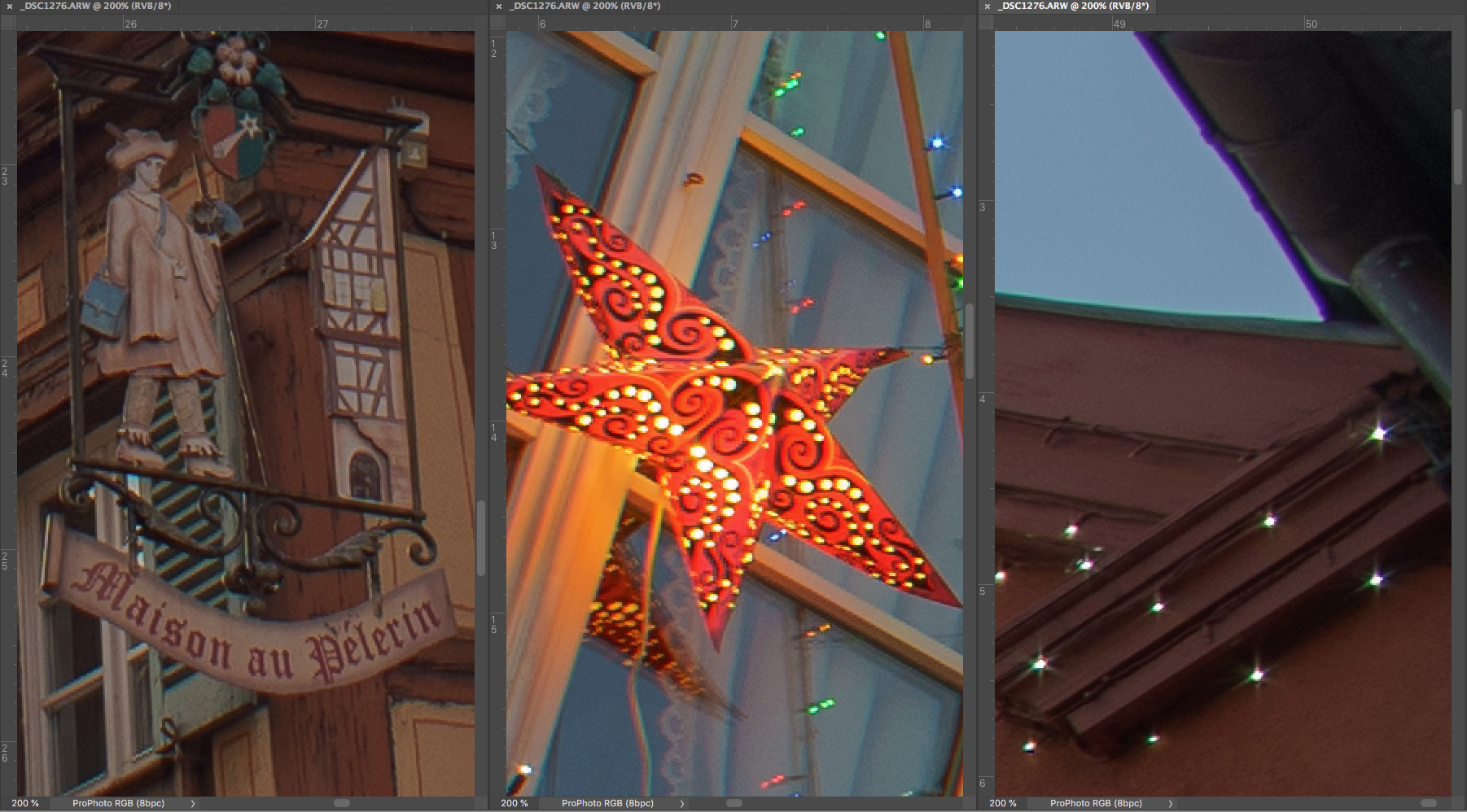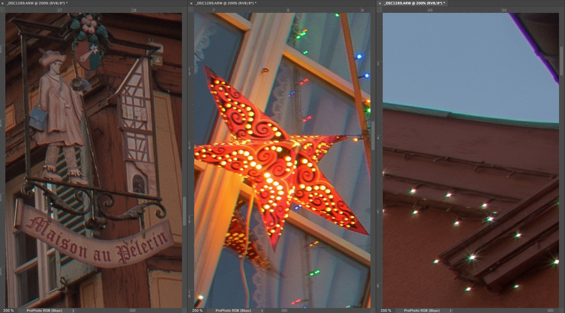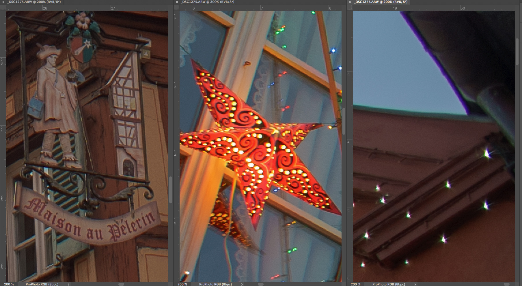 Nikon, Ausschnitte bei 200%, Bildmitte (links), linker Bildrand (Mitte) und rechte obere Bildecke (rechts).