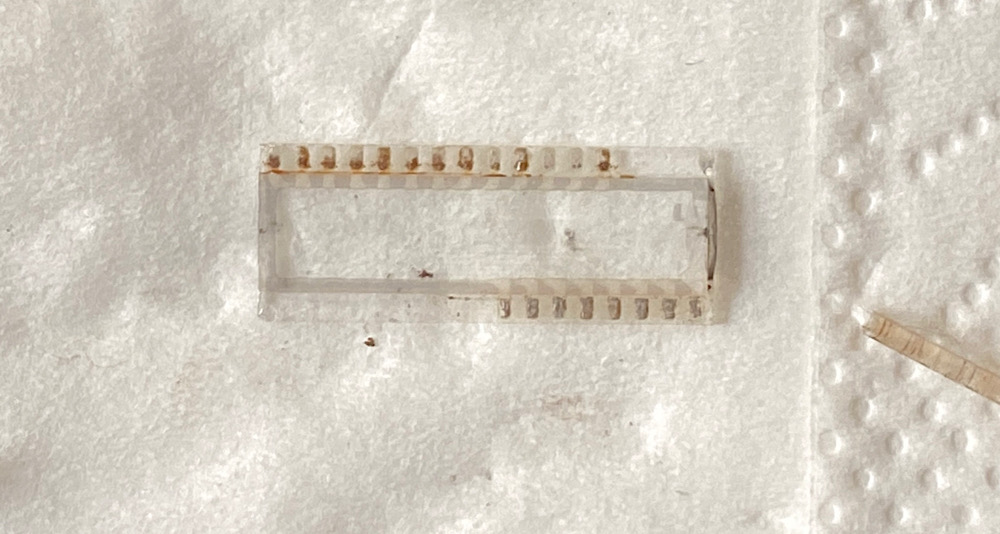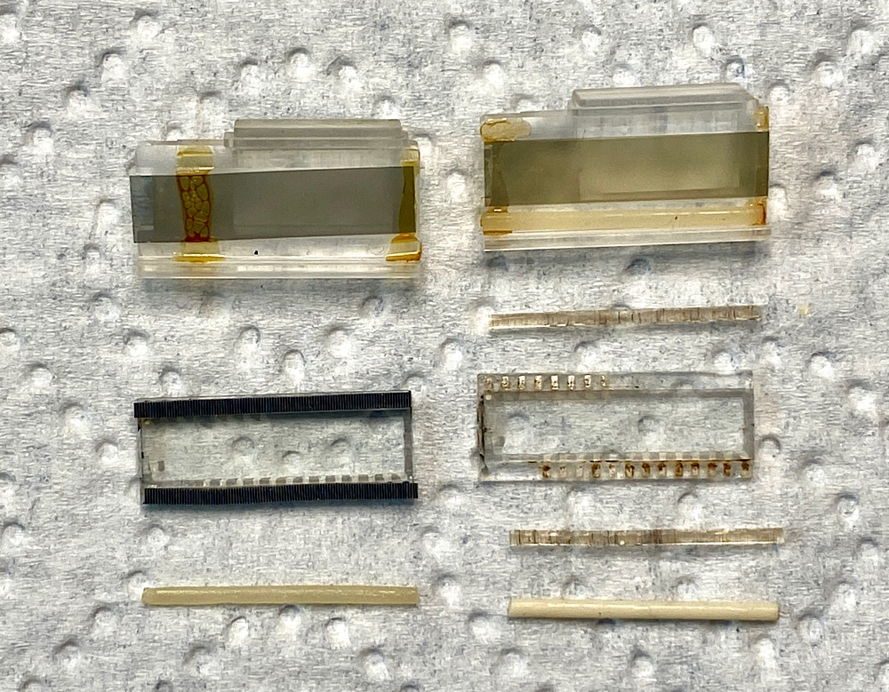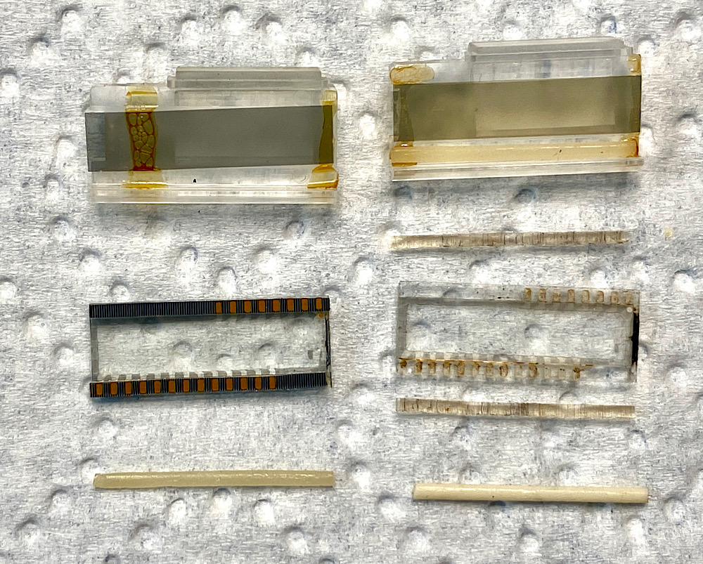 Es scheint so zu sein, dass das, was ich als Korrosion bzw. braunen Belag auf den Pads des Display ausgemacht hatte, die Reste des ursprünglichen intakten Zustands zeigt.