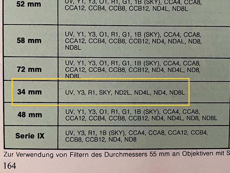 Apparently, the following filters are also available: UV (Ultra Violet), R1 (Red filter to provide stronger contrast with B/W photos), Y3 (Yellow filter improves the look of blue skies in B/W photos), ND (Neutral density filter for when you want to use long exposures or large apertures in very bright conditions).