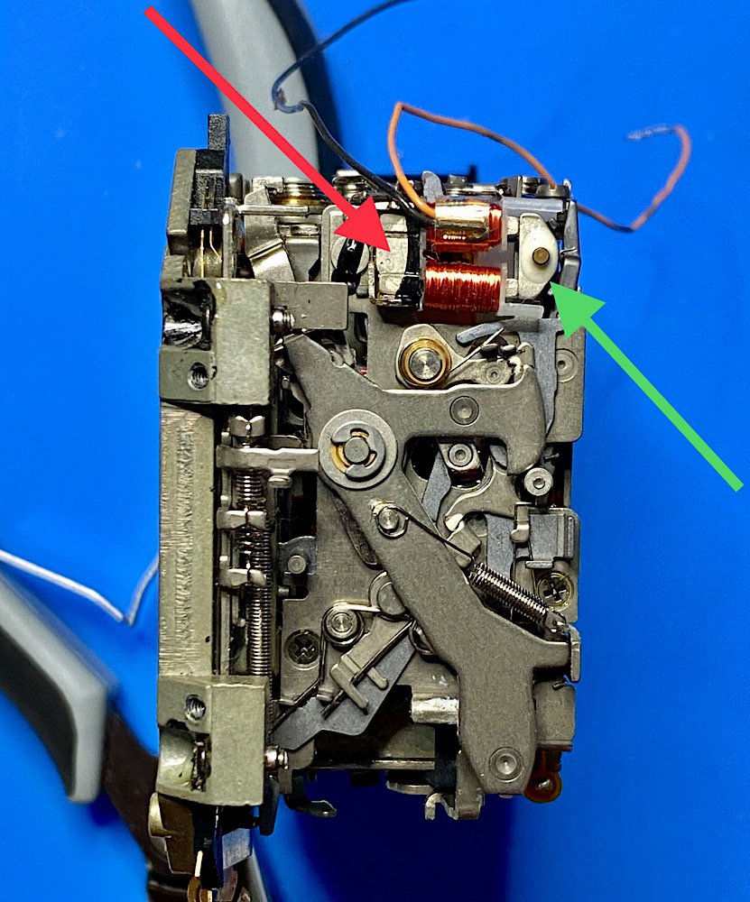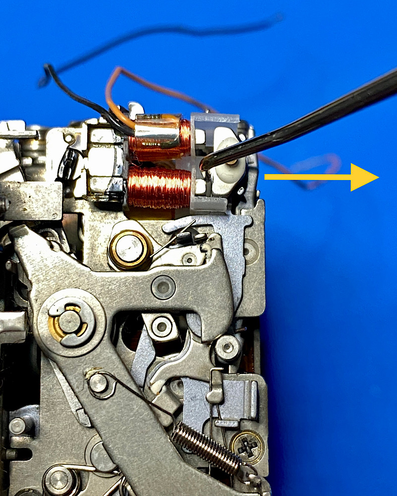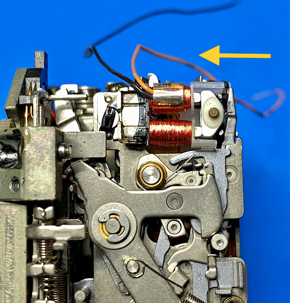 Seitenansicht - unten der Spiegelauslösemagnet mit Kupferwicklungen und seinen beiden Anschlusskabel.