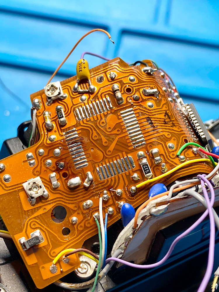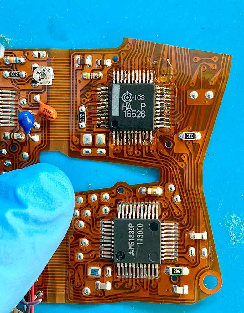 Die flexible Platine der X-700 mit den ICs 1 bis 4 (der IC rechts oben wurde bereits von mir "ver-arbeitet" beim Üben ;-)