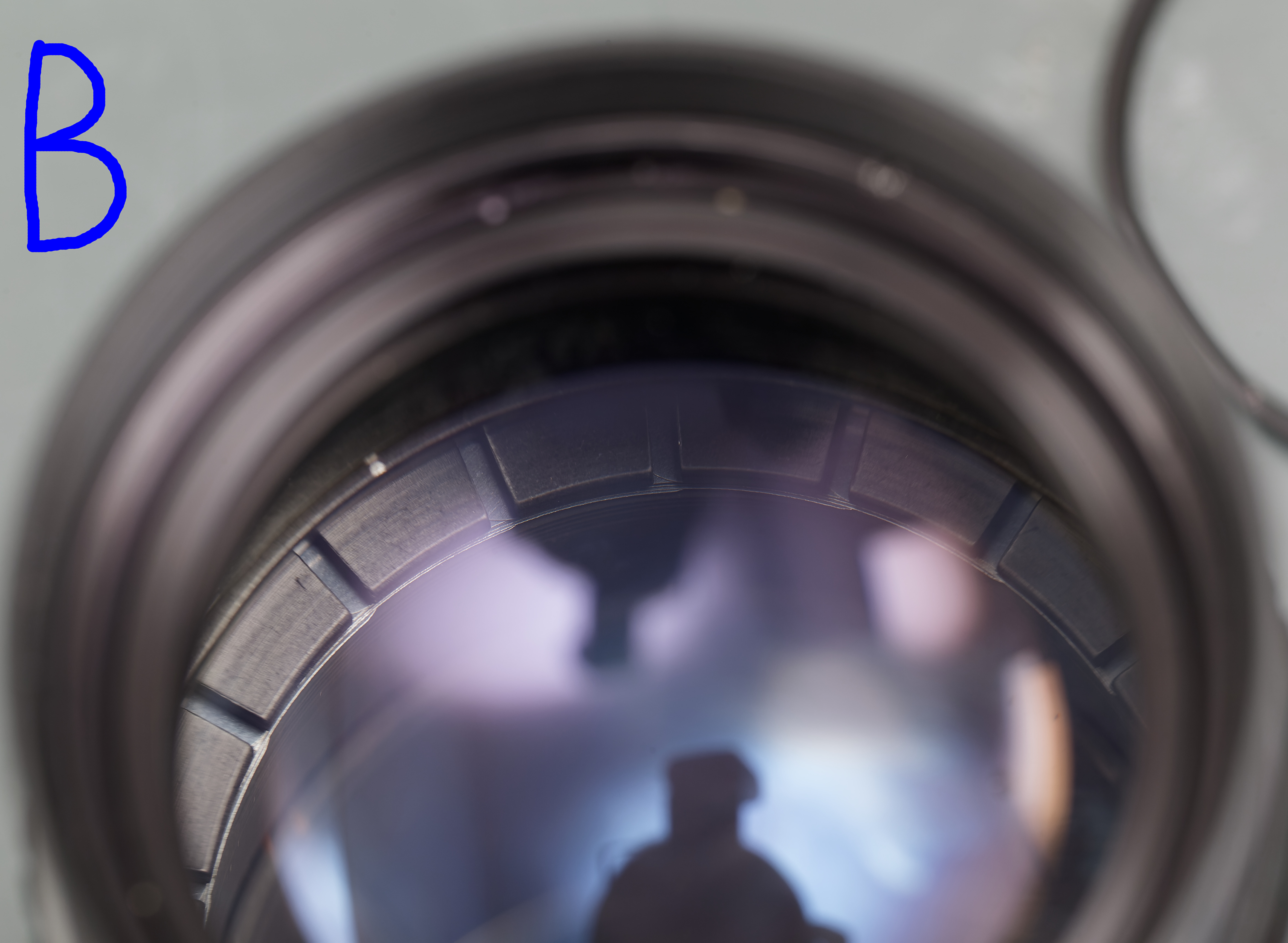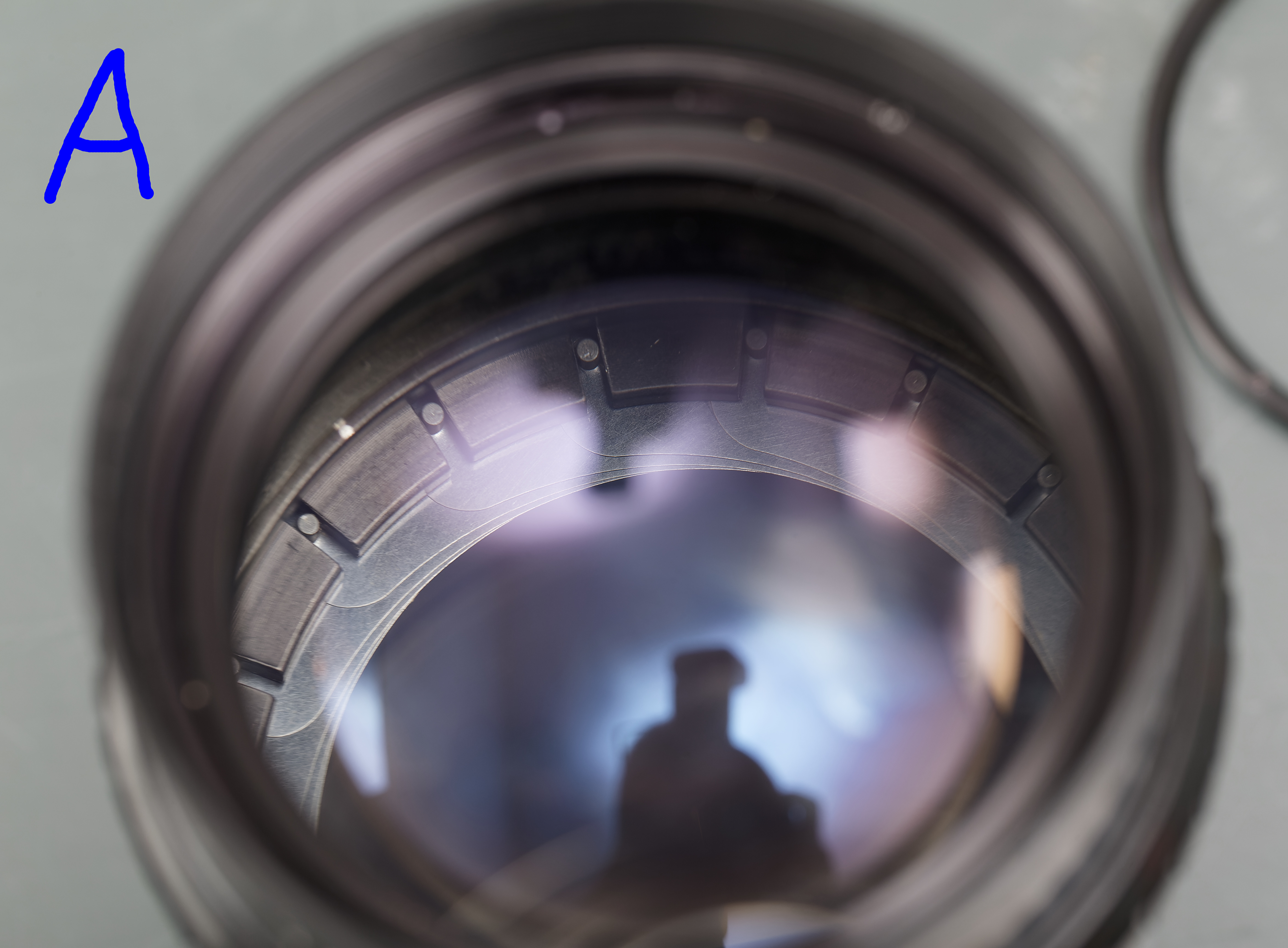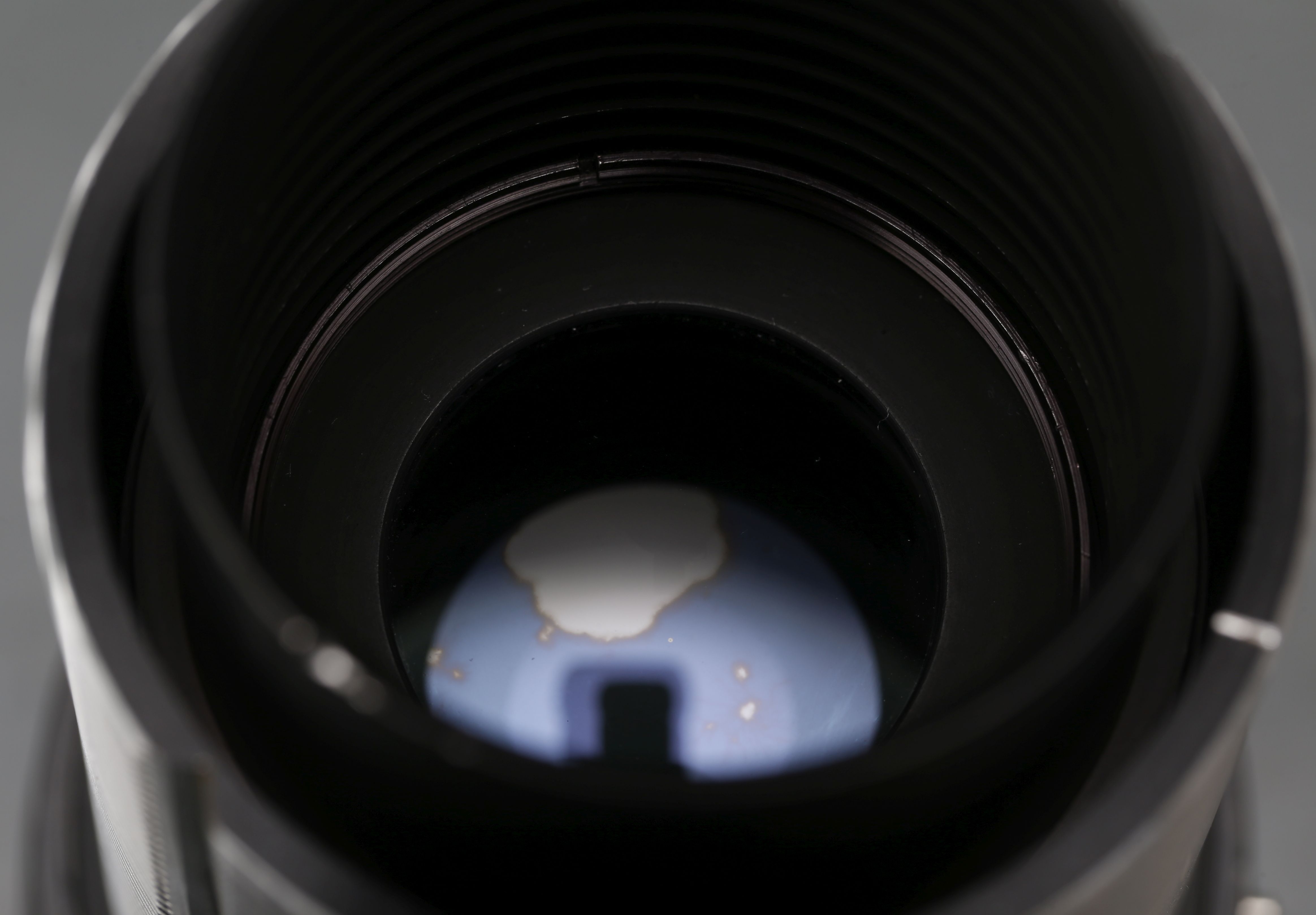 Die hinterste Linse von der Kameraseite aus gesehen. Der Pilz hat die Vergütung beschädigt.