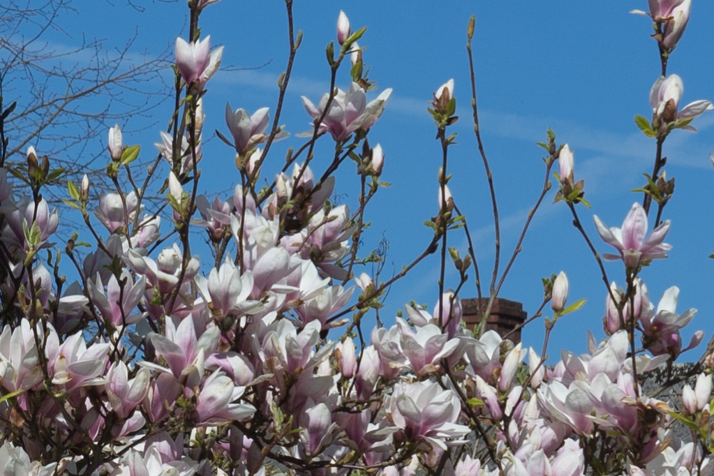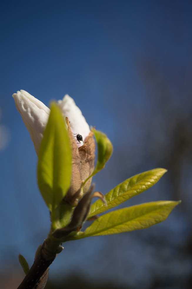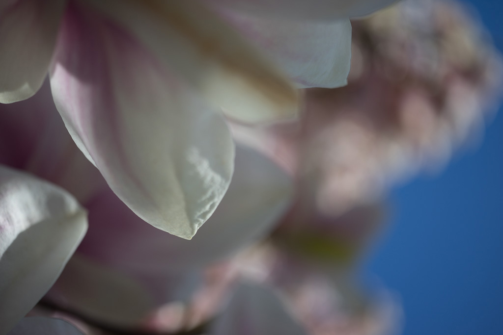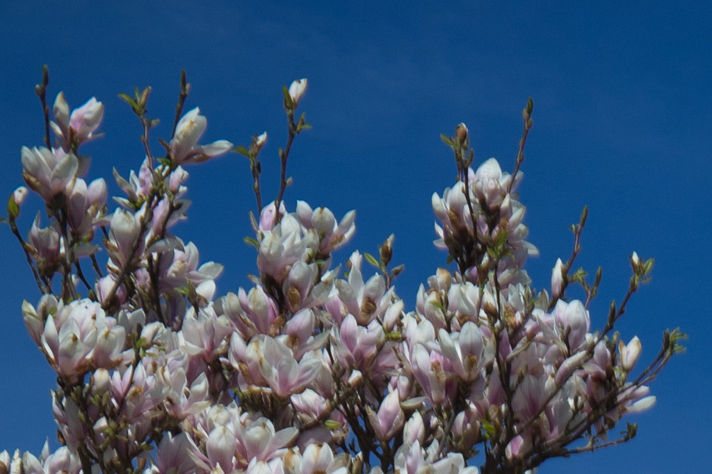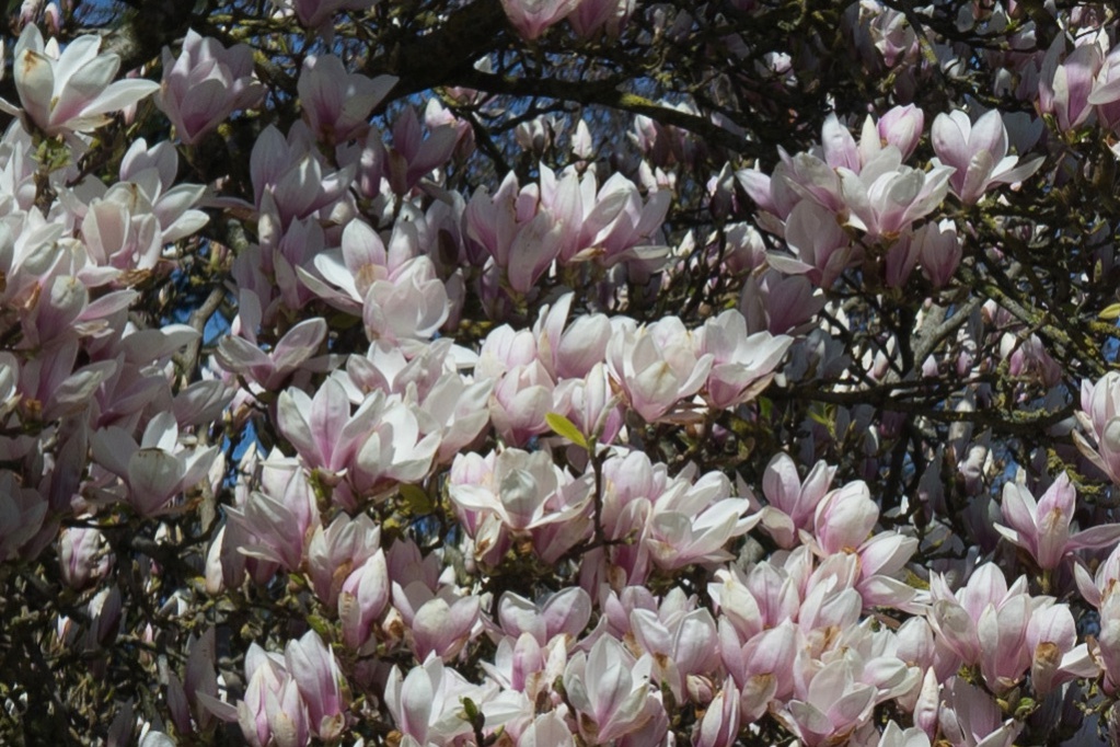 In der Unendlichkeitseinstellung bei Blende 8 zeigt es eine solide Leistung, wenn die Ecken und äußersten Ränder auch minimal schwächeln, allerdings nicht annähernd so extrem auffällig wie beim kleinen Vergrößerungsobjektiv Rodenstock Trinar 3.5/50, das ich - ebenfalls mit Magnolienbildern - hier vorgestellt habe (alle Fotos unbearbeitete RAW-Exporte aus LR, in Photoshop webgerecht aufbereitet):