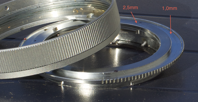 Ich hatte das aber mit dem Olympus Adapter einst an meinem Ojektiv begonnen, weil er neben dem notwendigen Abstand von 2mm, auch das exakte Übertragen der Bohrlöcher gestattete. Zudem lief auch der bei jedem Objektiv leider etwas differierende INfinity Punkt noch in den Einstellbereich für das Bereichsende.