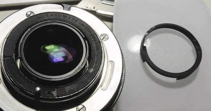 Ich habe den Schutzring, der die Rücklinse beim Aufliegen des Objektivs auf einer ebenen Fläche schützt, leicht modifiziert: der Ring ist aus Plastik und kann leicht bearbeitet werden, so dass der Spiegel einer Vollformat DSLR vorbeischwingen kann.