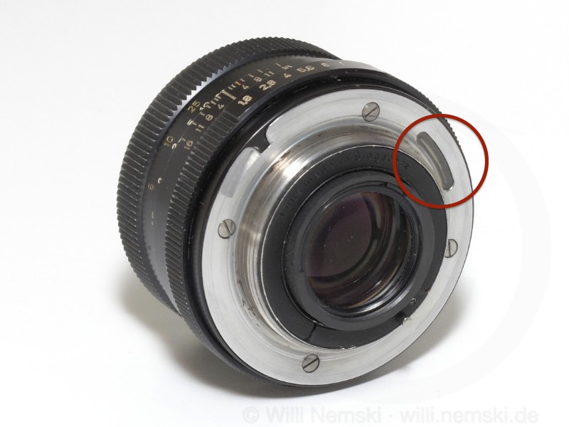 Die Metallplatte, die unter der Rückplatte liegt, wird von einer Feder gegen jene gedrückt und schließt so dicht mit dieser ab. Unter der Platte sitzt ein Stift, der, je nachdem, ob die Blende offen oder weiter geschlossen ist, gegen die Abschlussplatte gedrückt wird. Bei f/16 kann man also die Platte ziemlich weit in das Objektiv drücken.