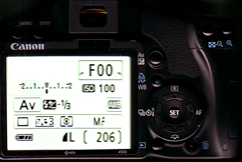 Ich verwende die Kamera mit Zeitautomatik (Av am Wählrad). Damit und mit meinen Adaptern ohne Chip habe ich F00 als Blendenwert im Display stehen (Siehe Bilder - Sorry, fürs Displaybild mußte ich meinen Scanner bemühen).