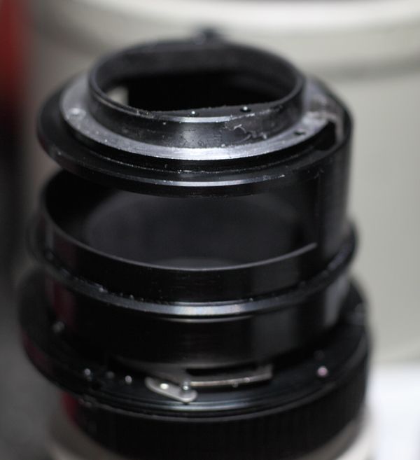 An diesem Kranz sitzt in der späteren Ausbaustufe dann auch die nach oben zum äußeren Blendenring laufende Verbindung. So ist mit der Drehbewegung des Blendenringes gewährleistet, dass sich der neu eingebrachte "Drehkranz" simultan zur Blendenschließung mit dem äußeren Blendenring bewegt.