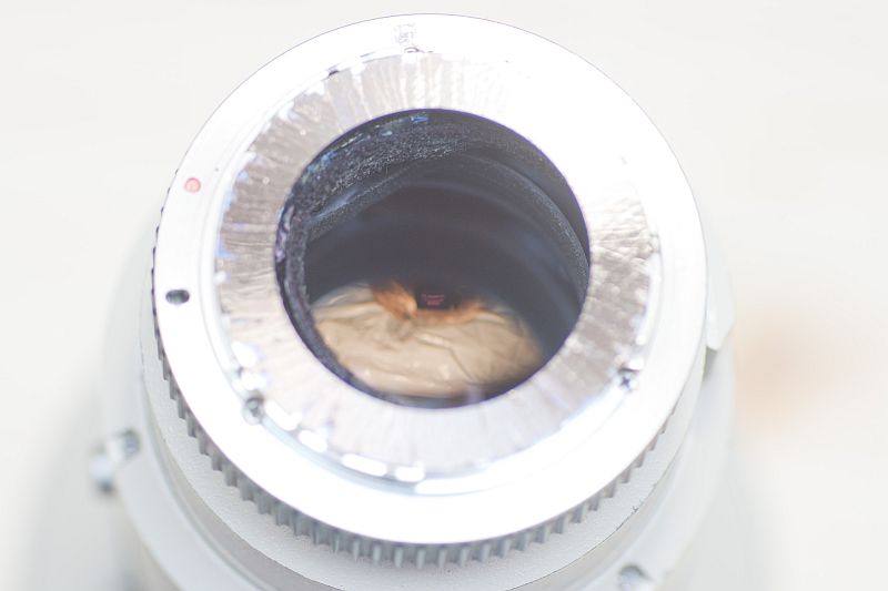 Man erkennt an der rechten Seite noch schemenhaft den nach Innen laufenden Hebel für die Blendenschließung, der am neu eingebrachten Kranz befestigt wurde.
