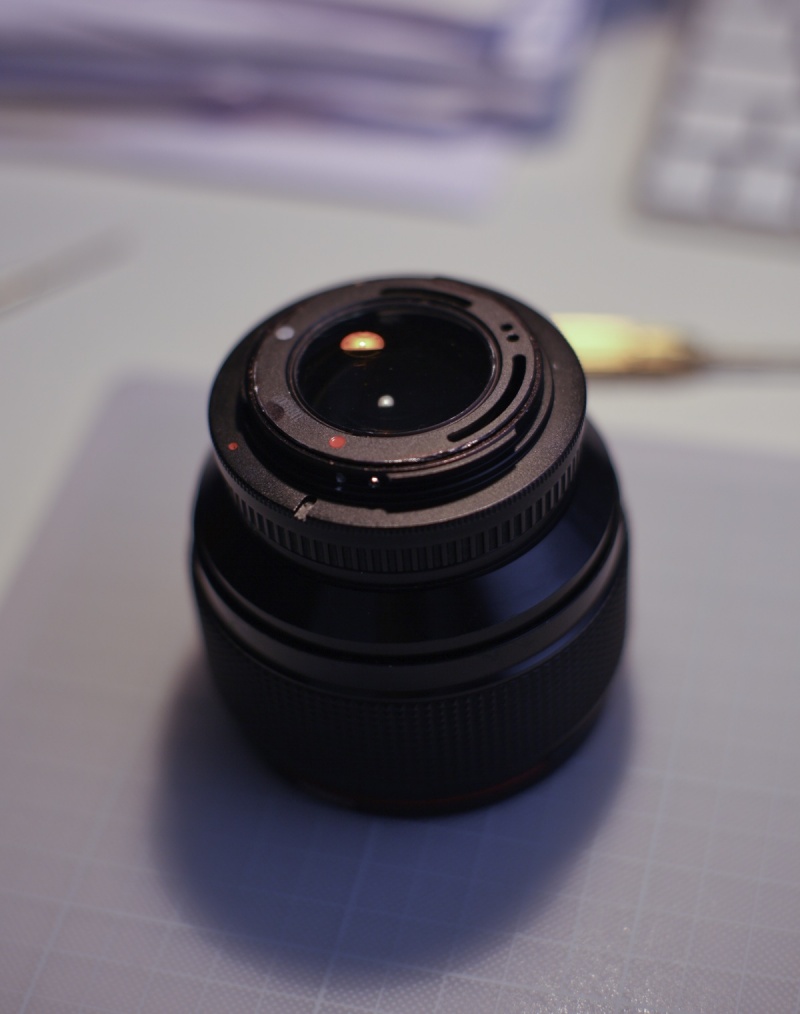 A: den unteren FD-Bajonett-Teil an der Hinterlinsenfassung abdremeln bis nur noch ein Zylinder mit der Rückinse bleibt.