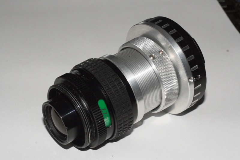 In Frage kommen bei der Lösung nur Objektive, die einen genormten Filterdurchmesser von 40,5 x 0,5mm besitzen, wie es die neueren Objektive von Schneider Kreuznach, Rodenstock und z.B. Nikon in der N Version besitzen. Hier gezeigt ein Durst Neonon 2.8/50mm (vermutlich von Schneider für Durst gebauter 6-Linser mit 8 Blendenlamellen), das ebenfalls ein solches 40,5er Filtergewinde besitzt.