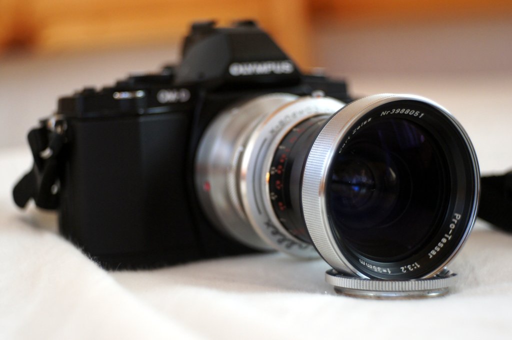 So sieht das ganze Provisorium an der Olympus OM-D E-M5 aus: