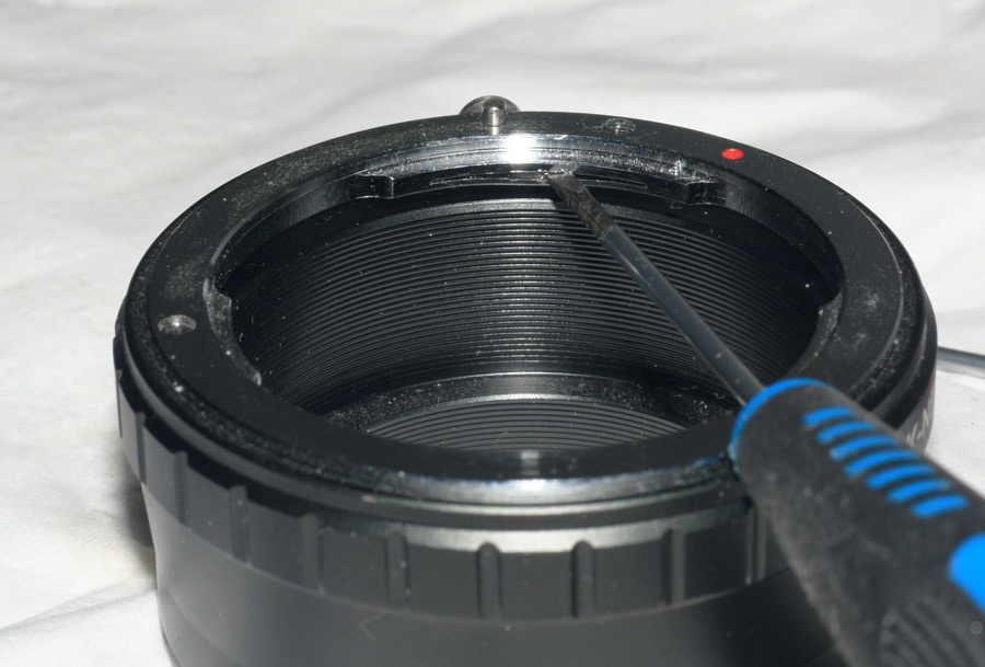 Bitte mal umlaufend an allen 3 Blechen die Spreize - wie hier im Bild gezeigt - "nach unten" ausfahren durch leichtes "Einstechen" mit einer dünnen Schraubendreher-Klinge... und dann wundern wieso die Objektive nun halten und die Adapter gar nicht mehr so "liederlich" verarbeitet sind wie sie ursprünglich erschienen...:lol: