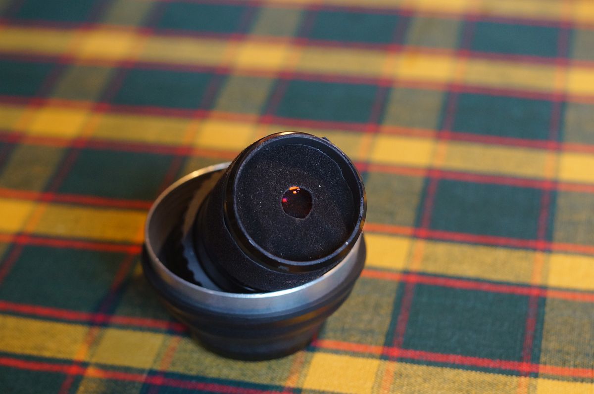 Bilder vom Objektiv und auch von meiner handgeschnitzten Lochblende, die ca. Blende 7 haben dürfte.