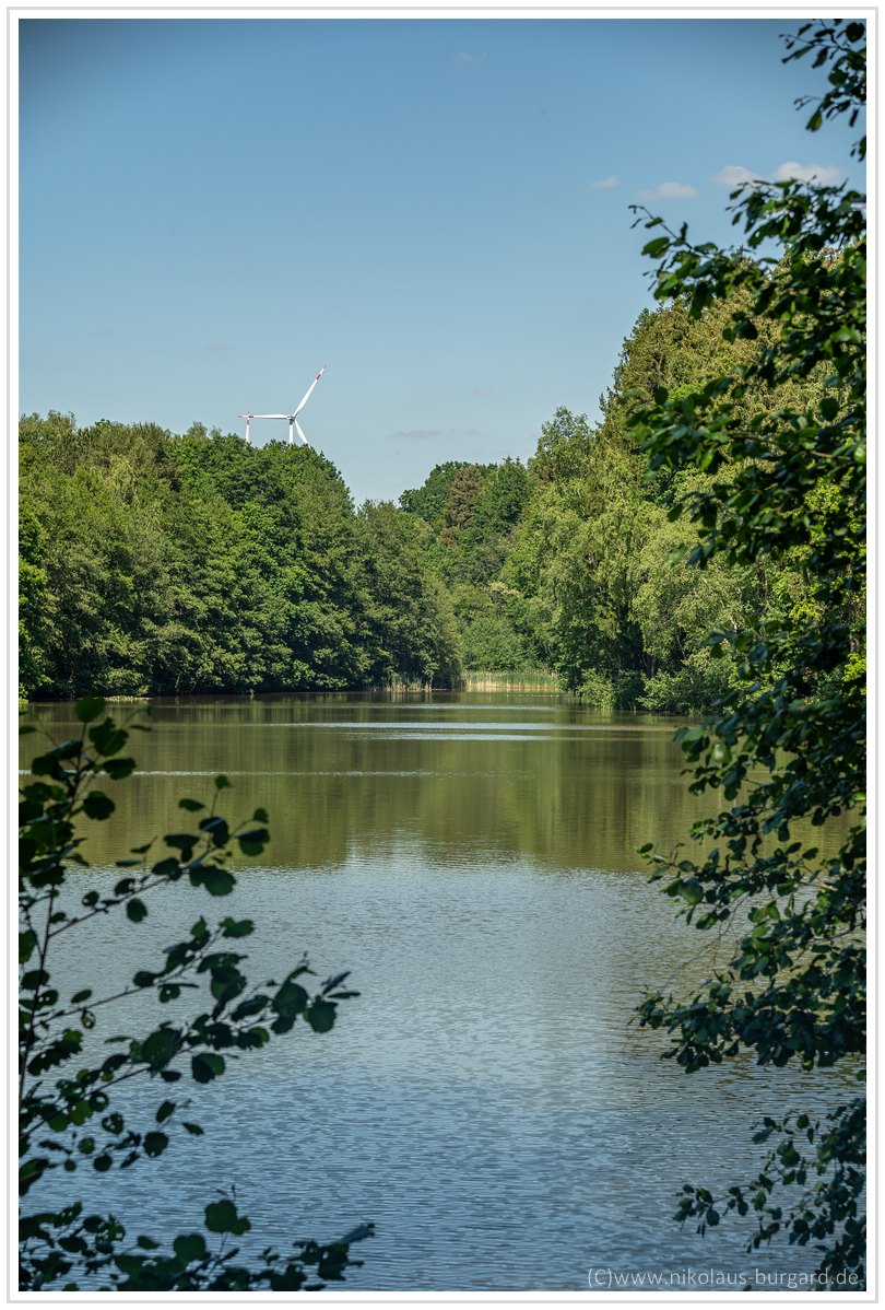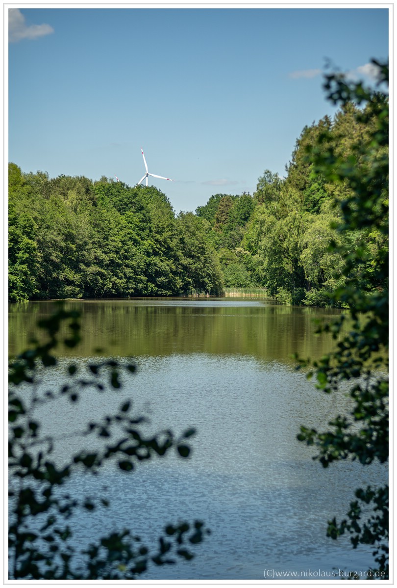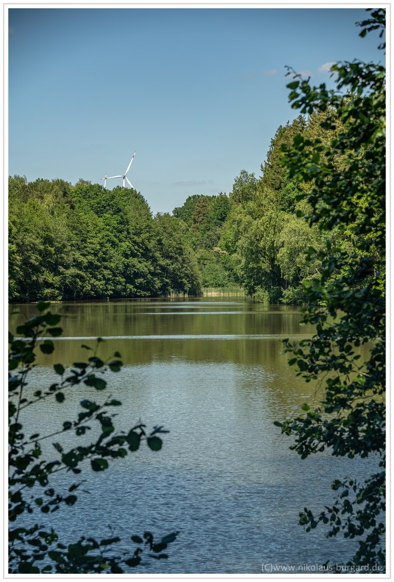 Fokus lag auf den Schilfgräsern am anderen Seeufer links unterhalb der Bäume. Es gibt gegen unendlich nicht nur eine Ausdehnung des Schärfebereichs, sondern auch eine leichte, absolute Schärfesteigerung.