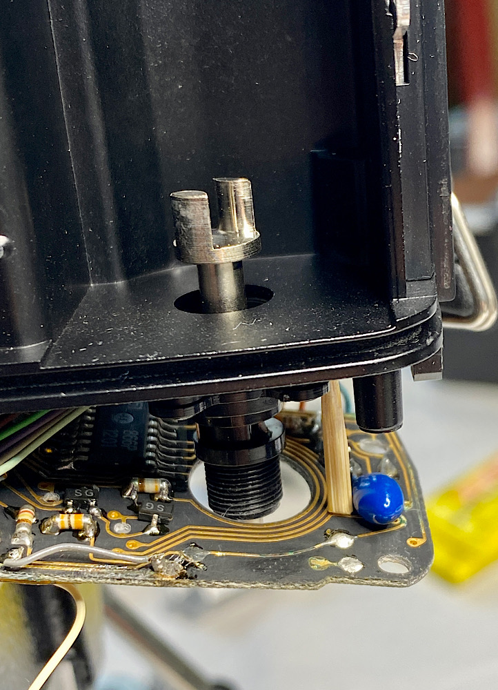 Ein gekürzter Zahnstocher stützt wieder die gelöste Platine ab.