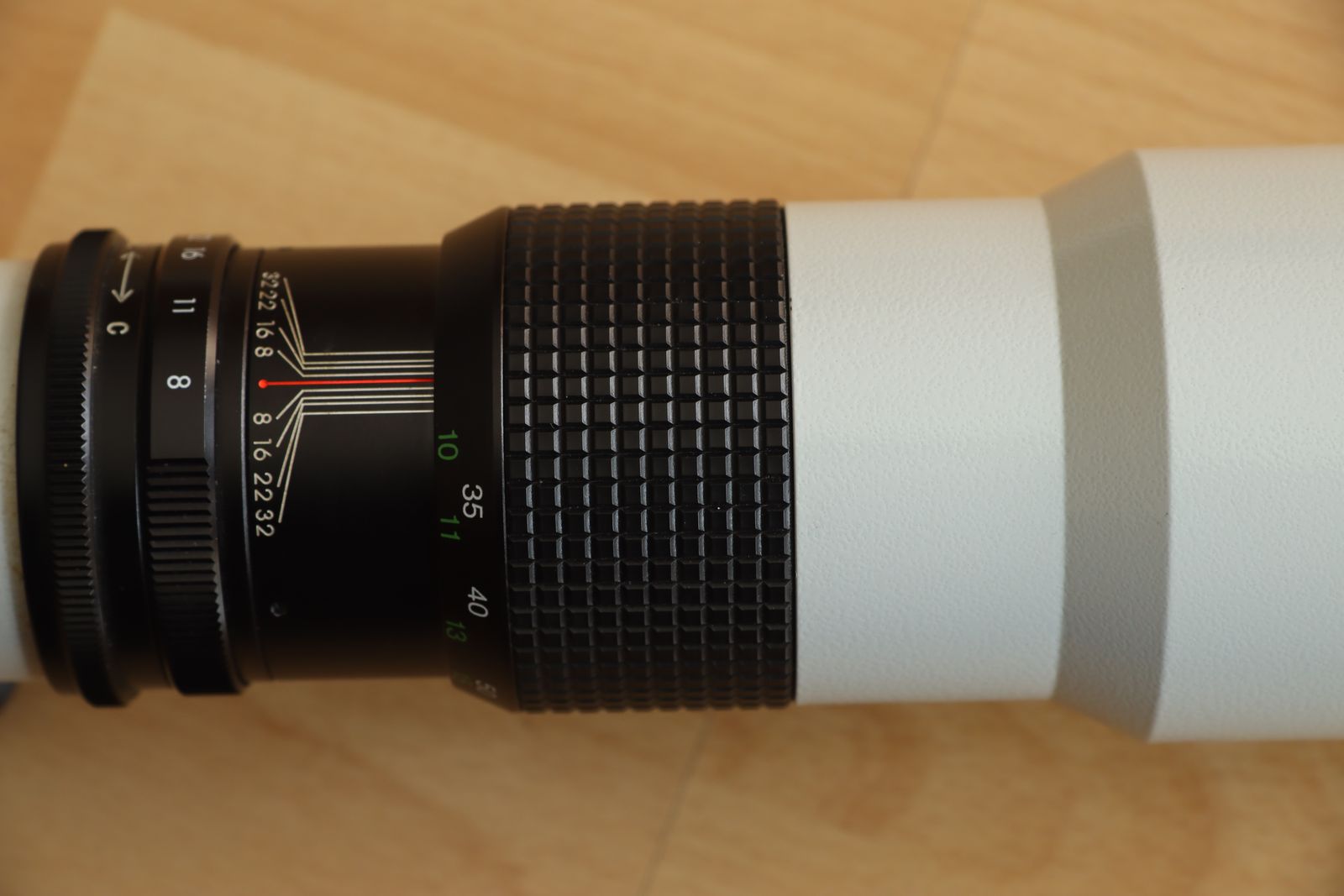 Die anfänglich gezeigten 3 Madenschrauben sitzen viel zu tief vom Geschehen entfernt und dienen eigentlich nur zum Verschieben der Anschlagsbegrenzung beim Fokussieren. Gerade weil bei so langbrennweitigen Objektiven der Unendlich - Anschlag bei der Montage im Werk nur exakte festzulegen ist, weil es immer Toleranzen gibt. Nachdem die 3 Madenschrauben gelöst wurden, sollte sich nur die Meterskala entsprechend verdrehen lassen.