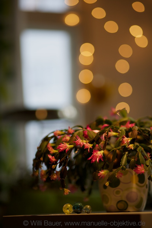 In der Nahgrenze wirken beim EF 1.8/85 die Highlights wie beschnittene Kreise, da fehlt der "Swirl"-Effekt weitgehend. Das EF 1.8/85 schneidet die Highlights gleichmäßiger (besser) an, wenn der Fokus bei 1,5 bis 2 Meter liegt (siehe letztes Bild). Insgesamt wirken die Scheibchen aber sehr homogen ausgeleuchtet, mit keinerlei Tendenz zum kringeln.