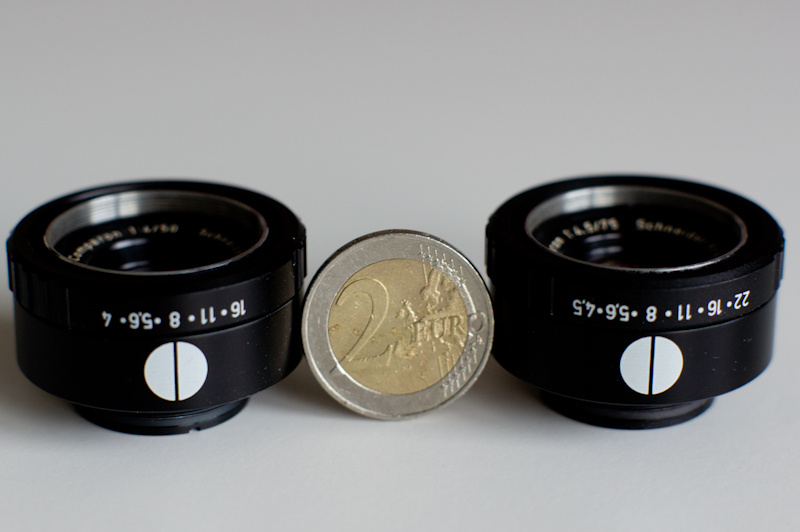 Diese Woche brachte der Postbote ein Päckchen mit zwei neuen Vergrößerungsobjektiven: ein Schneider-Kreuznach Comparon 1:4/50mm und ein Comparon 1:4.5/75mm. Beides sind Vierlinser vom Tessartyp. Dass sie klein sind, habe ich schon aufgrund des M25 Gewindes vermutet, aber es sind zwei echte Winzlinge: