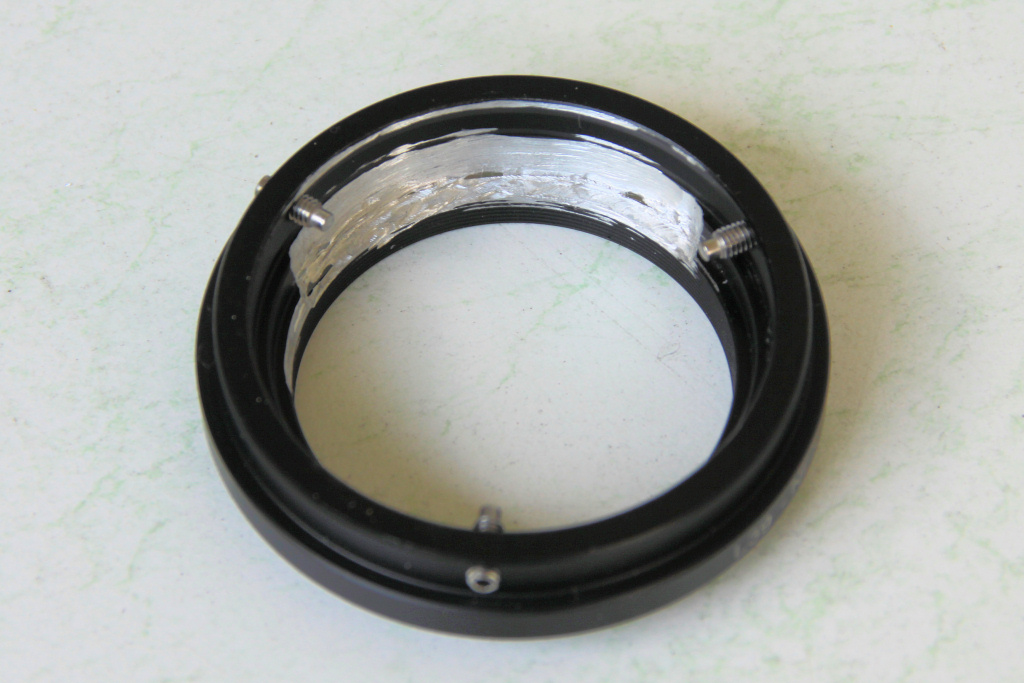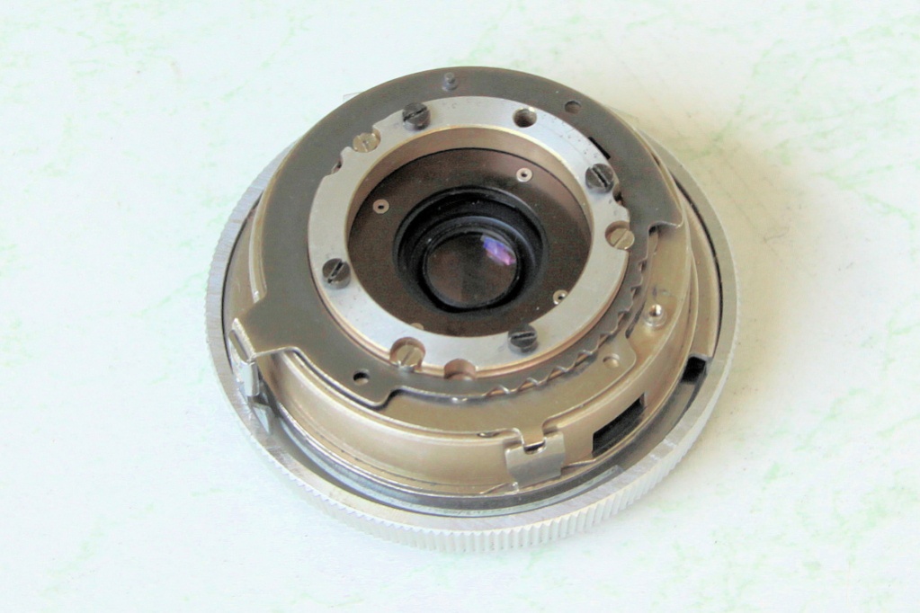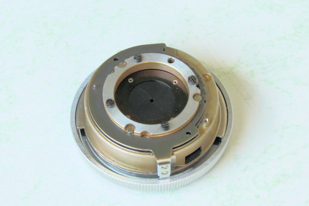 Den Ausbau habe ich schon vor längerer Zeit vorgenommen. Das Objektiv ist ziemlich blöd mit der Trageplatte, die Teil des Kameragehäuses ist, verbunden. Diese Platte wird für den Erhalt des Objektivs zwingend weiter benötigt, sie kontert die Komponenten des Objektivs, ohne die Platte fällt alles auseinander. So blieb mir nichts anderes übrig als die Platte zu zersägen und zu befeilen, bis eine runde "Rückplatte" des Objektivs bildet.