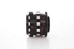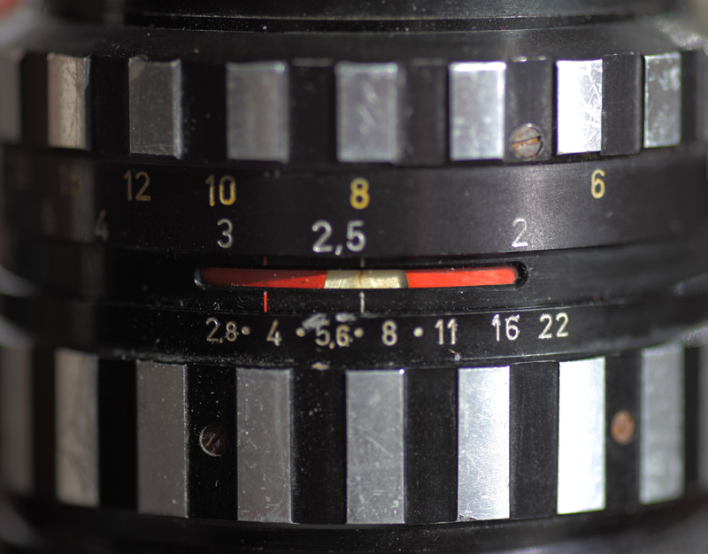 Und nun ist mir noch ein zweites zugelaufen.. jüngeren Datums und mit nur 6 Blendenlamellen. Die optische Grundformel dürfte gleich sein, denn sowohl die Anzahl der Linsen als auch deren Durchmesser, Krümmungsradien etc.. ist gleich geblieben. Konstruktiv wurden wohl nur Dinge an der Blende verändert und bieten nun ein lustiges Feature, das ich toll finde, erinnert es mich doch an die alten "Röhrenradios" aus Omas Zeiten.. (Stichwort magisches Auge.... http://de.wikipedia.org/wiki/Magisches_Auge_%28Radio%29)