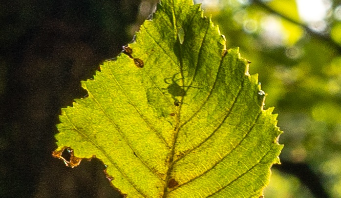 Beim Kontrollieren der Schärfe fand ich dann noch eine sich auf der Blattrückseite versteckende Spinne, die vom durchscheinenden Licht sichtbar gemacht wird :clapping