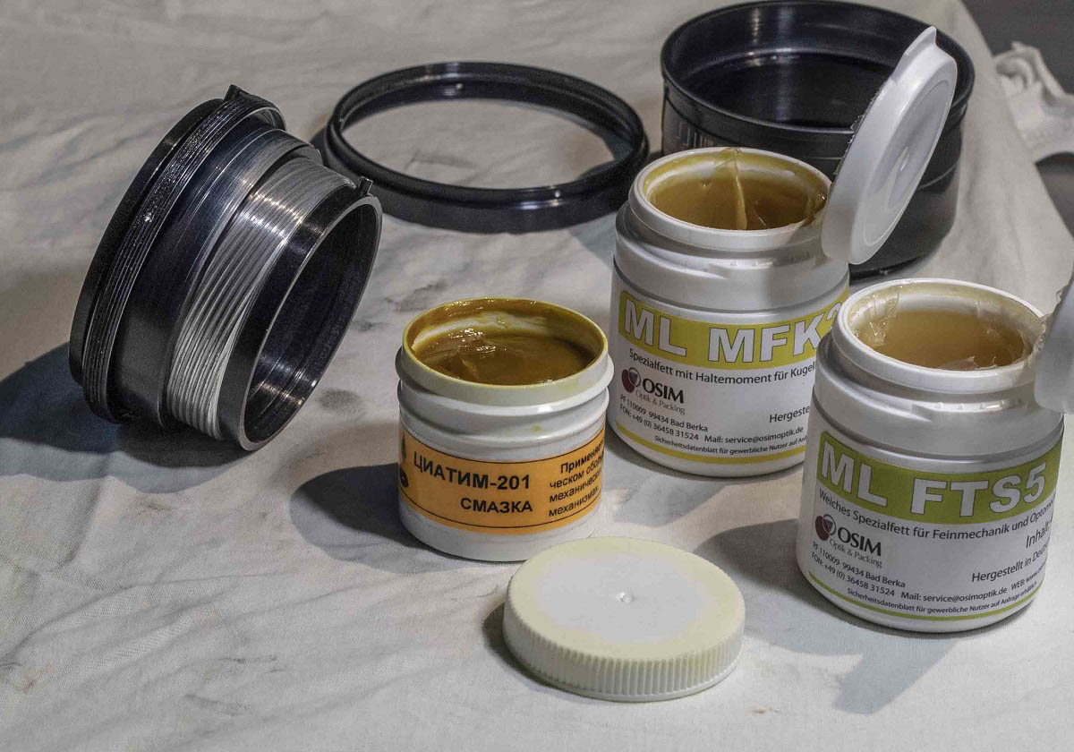 Habe das russ. Schmierfett Ciatim-201 im Zulauf und möchte damit mein Helios 40-2 neu fetten. Obwohl mein Objektiv (leider) von 2013 ist, sieht es äußerlich eher nach 19-hundert-irgendwas aus.