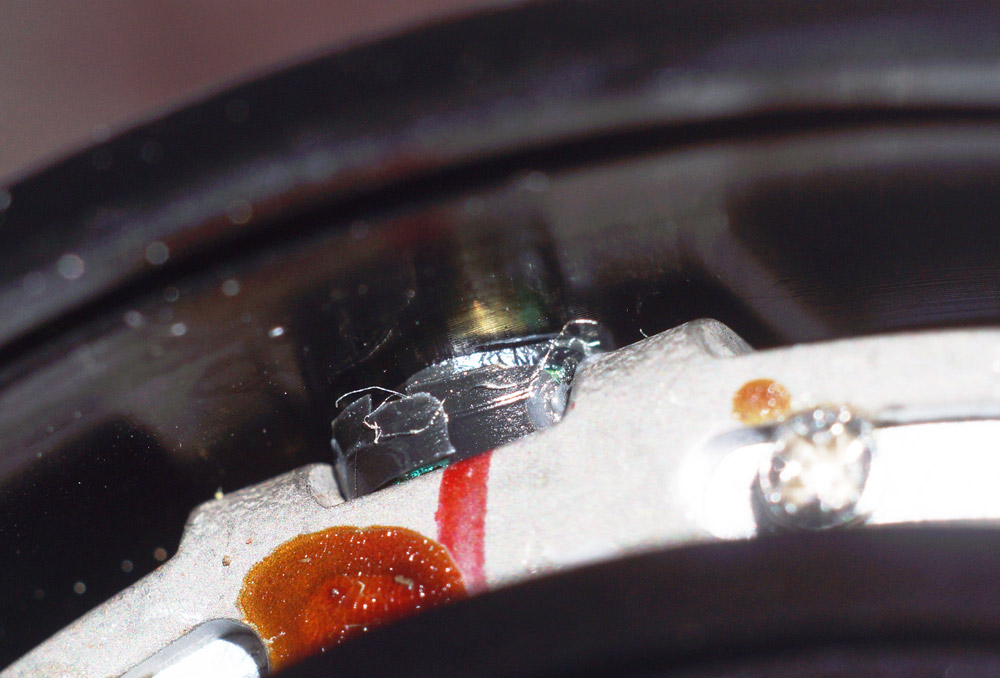 Man sieht sehr schön noch im eingebauten Zustand, wie die Plaste sich bereits von der Gleitlagerrolle gelöst hat... das machte ein "Geschlacker" von rund 1,5mm beim Fokussieren aus.
