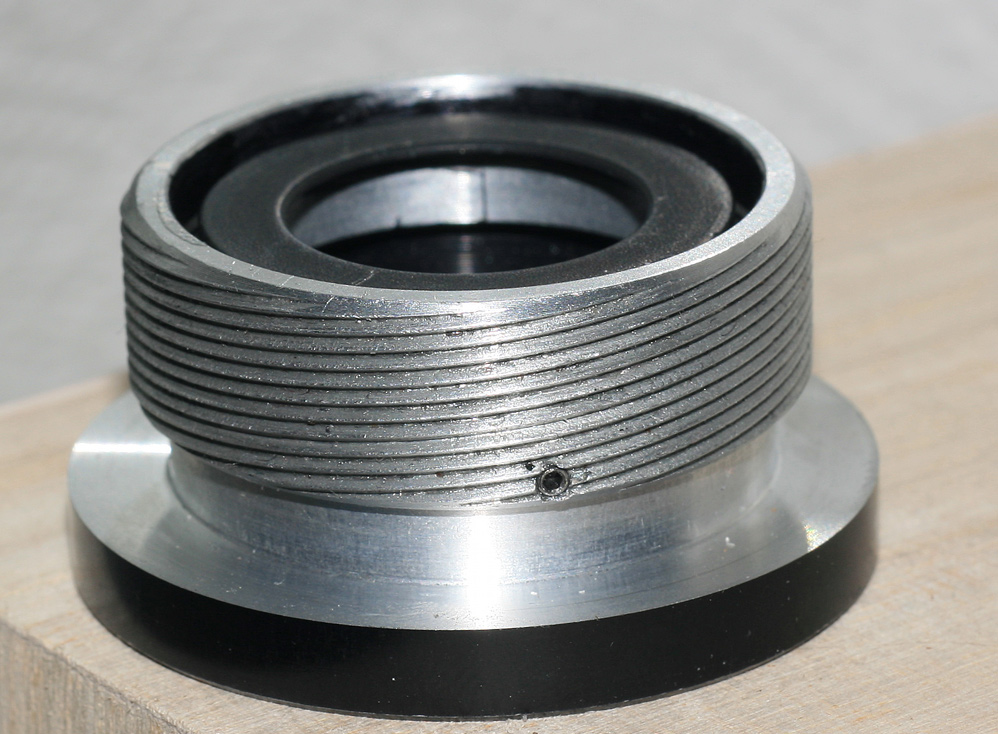 Zunächst der Rücklinsen-Block des Meostigmat 1/50mm zurechtgekürzt an der Drehbank und ausgestattet mit einem Gewindeteil des Kurzhelicoids... kurz vor dem endgültigen Zusammenbau... (das Gewinde ist fürs Foto nur lose oben aufgesteckt und rutscht nachher ganz bis an die untere Begrenzung, damit es den kompletten "Hals" des Rücklinsenbereichs bedeckt)