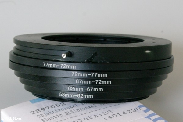 Vorab: Die Blende ließ sich trotz 76.5 mm Außendurchmesser nicht in den letzten StepUp Ring mit 77 mm einschrauben. Daher habe ich einen Step-DOWN Ring 77 mm - 72 mm zusätzlich angesetzt, der einen planen Abschluss hat. Darauf habe ich dann die IRIS Blende mit Sekundenkleber festgeklebt.