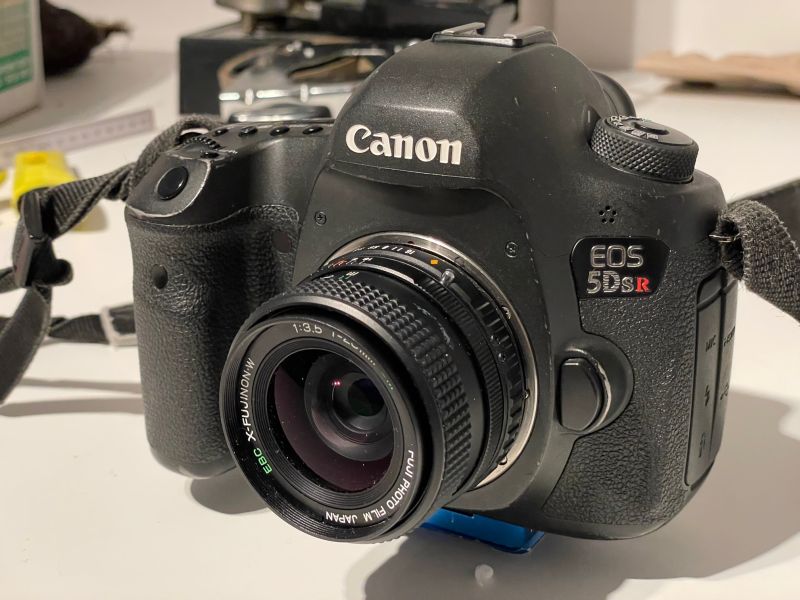 Nun ergab sich eine günstige Gelegenheit, ein solches Stück zu ergattern. Allerdings bin ich ja einer der unverbesserlichen Dinosaurier, die noch mit der 5D rumhantieren. 43,5mm Auflagemaß zu 44mm Canon, da wird ein Adapter mit -0.5mm Dicke benötigt – tja, merkwürdig, dass ich keinen gefunden habe. Aber durch den Verdacht getrieben, dass Fuji ja seinerzeit erst mal M42 bedient hat, bevor sie ihr Bajonett herausbrachten, habe ich es mal drauf ankommen lassen… Bilder von der relativ dicken Fujica-X Anschlussplatte sprachen ebenfalls deutliche Worte in Richtung Umbauversuch.
