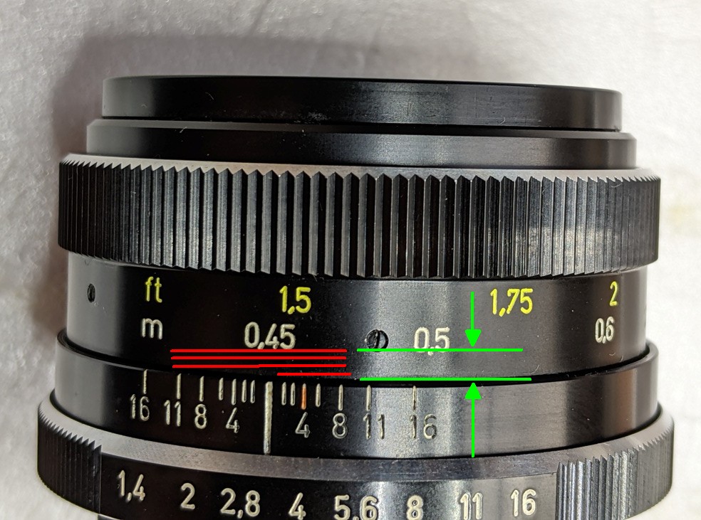 Sowohl die Blendenzahlen als auch die Entfernungszahlen überstreichen den Anzeigestrich vollständig und richtig vom einen bis zum anderen Ende und haben dann ihre Endanschläge. Und weil das so ist und ich nach so vielen Versuchen nur diesen einen und keinen weiteren Einfädelpunkt gefunden habe, bei dem die Skalen richtig überstrichen werden, denke ich, den Einfädelpunkt des Fokusgewindes habe ich erwischt.