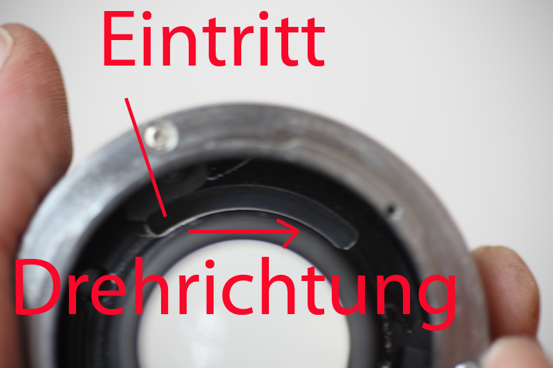 Eine solche Lösung ist absolut umständlich im späteren Handling des Objektivs und zudem auch gefährlich. Der Gedanke, mittels einer STOPP-Schraube wie beim Olympus Adapter zu arbeiten, kann getrost verworfen werden, weil die Eindrehrichtung des nFD Bajonett dafür leider genau verkehrt herum läuft, um den Schlaghebel für die Abblendung zu begrenzen beim Eindrehen..