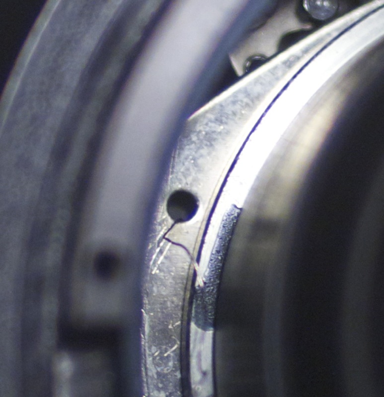 2. Rueckstellfeder fuer die Blende modifizieren. Leider war das die einzige Feder aus dem Fundus. Wenn ich bei Blende 1.2 bin und abblende, bleibt sie erst mal bis Blende 4 (oder so) haengen und schnalzt dann ploetzlich los. Dann kann ich aber wieder Schritt fuer Schritt auf- und abblenden. Nur wenn ich wieder bei 1.2 bin haengts. Ich koennte die Feder etwas kuerzen, aber ich denke ich lass das erstmal so bis mir eine besser geeignete Feder ueber den Weg laeuft.