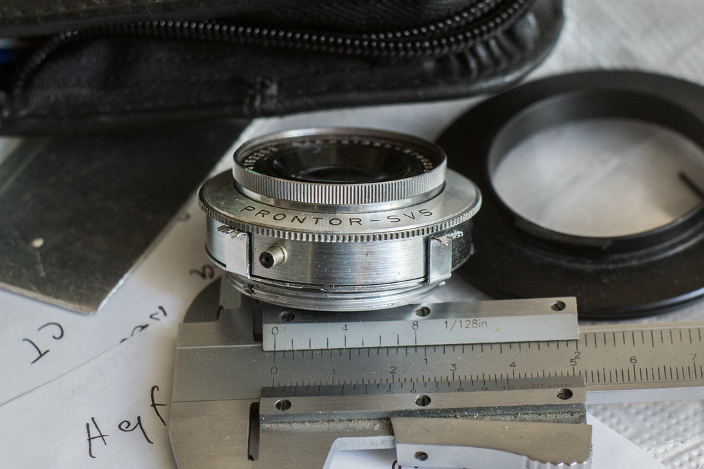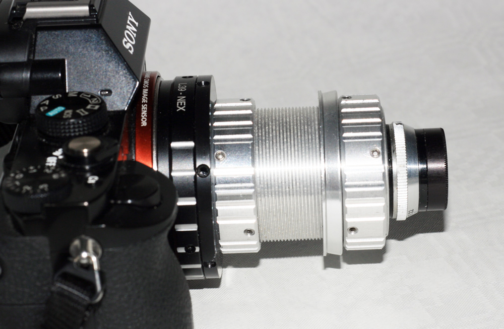 Mit seinem Durchmesser von nur 24mm im Frontbereich, aber einem etwas vom M25 Gewindedurchlass abweichenden Anschlussteil, wurde es mit einer M27er Wandlerplatte zentriert und dann an das VNEX KB und die Sony A7 gebracht.