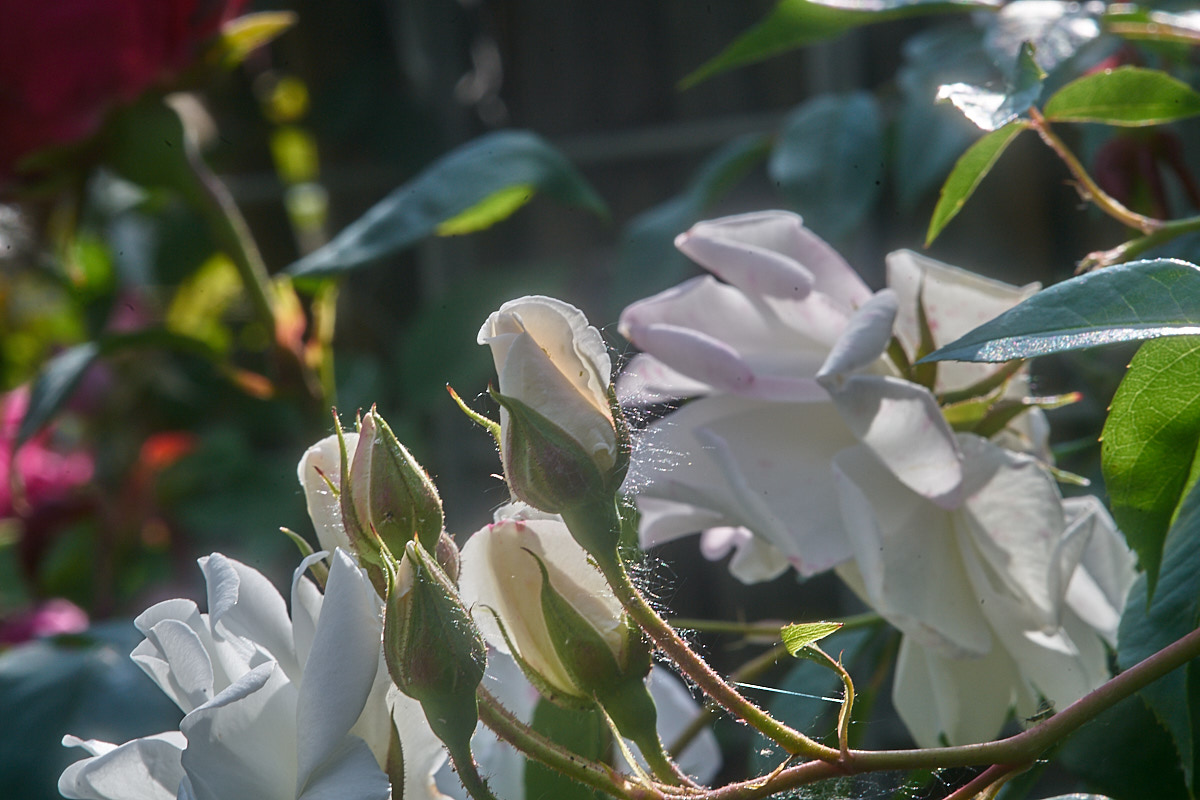 Was auffällt, sind "Überstrahlungen", die aber nicht vom Objektiv herrühren, sondern von zu kurzer Gegenlichtblende, einem nicht mattiertem Adapter und/oder dem ebenfalls ungenügend mattiertem Zwischenring. Gerade die billigen Adapter leuchten durch das einfallende, gebündelte Licht innen wie polierte, schwarze PKWs (oder wie die glasierten Dachpfannen in Neubaugebieten). Das gilt auch für die Kunststoffoberflächen der Meike-Zwischenringe, die ich ebenfalls habe (erheblich teurer, dafür ganz matt sind nur die von Kenko). Hier lohnt sich Mattlack von Tetenal (kann man in eine Filmdose sprühen und flott mit einem Pinsel auftragen), Tafelfarbe oder -am besten- "Dc-Fix Samt".